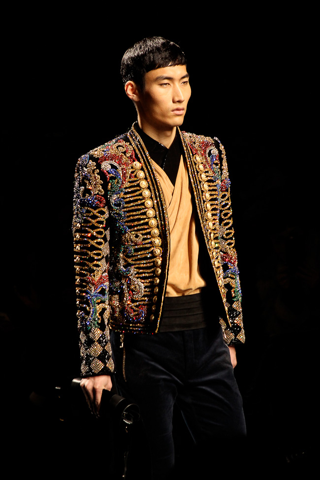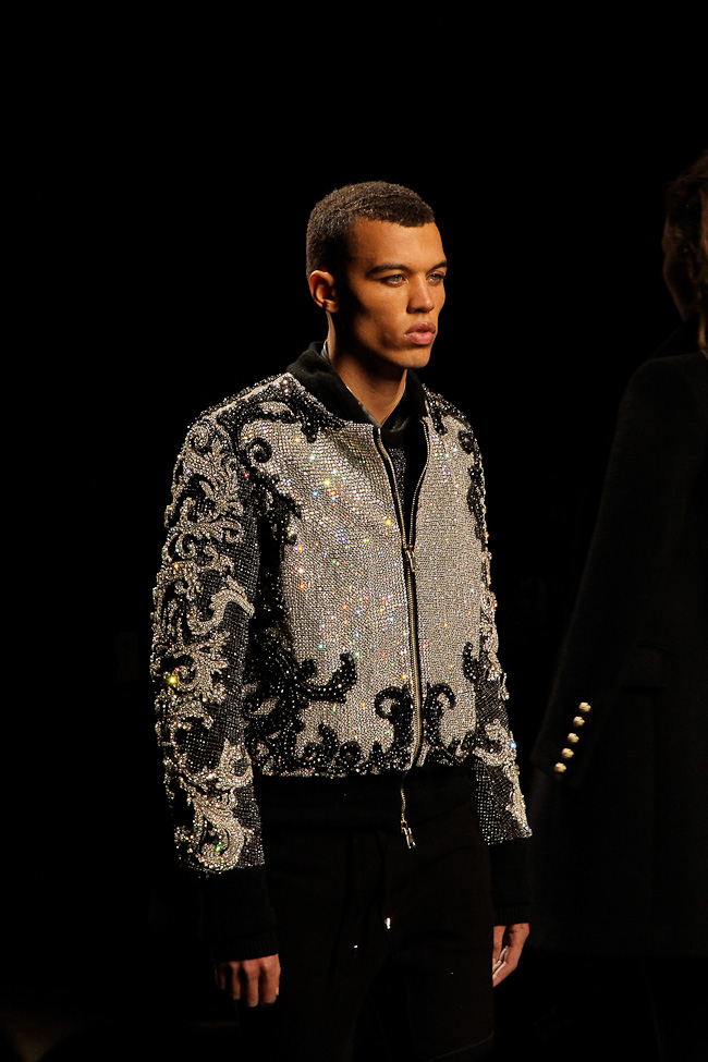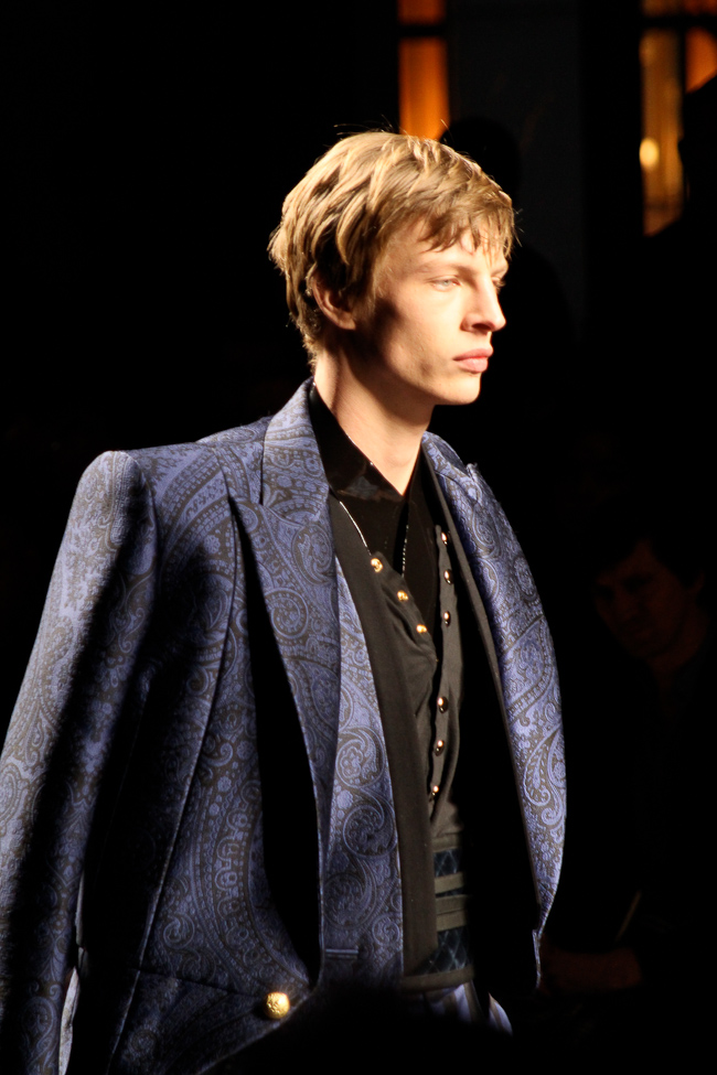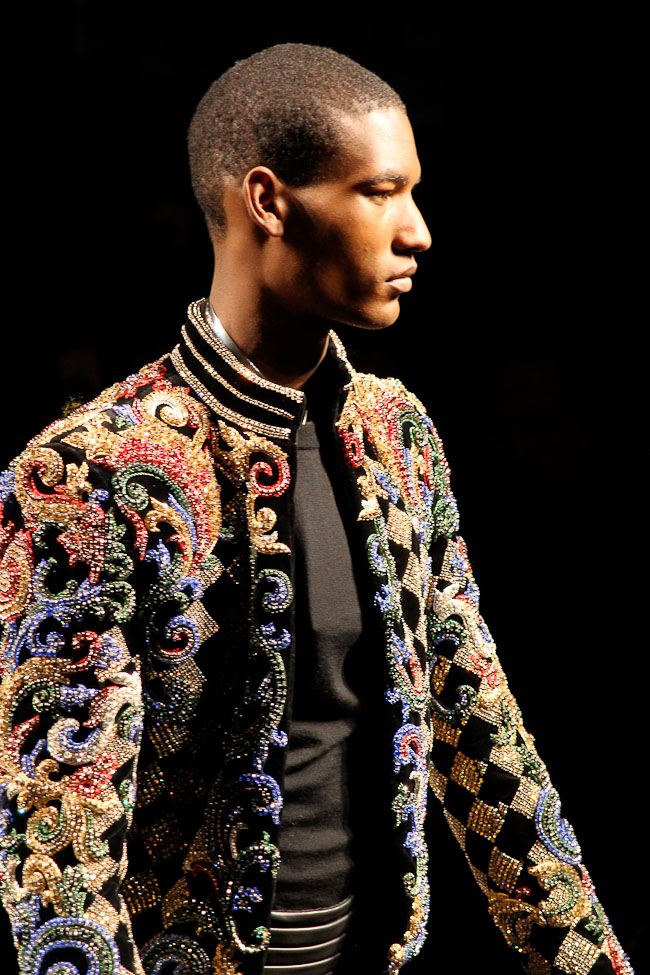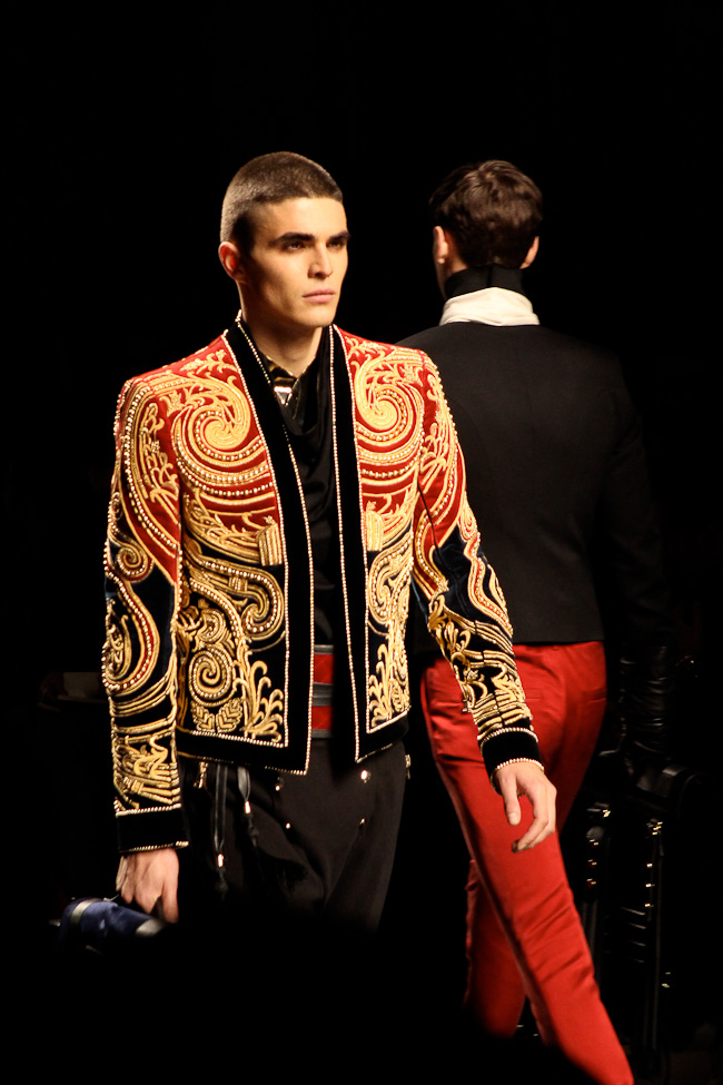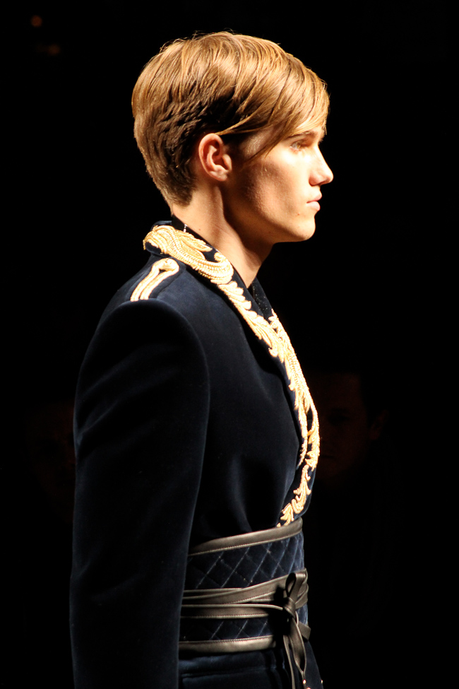 Ça brille ! Quel faste ! Ce défilé est probablement le plus spectaculaire de la saison. Dans le somptueux Hôtel Potocki à Paris, avec un orchestre d’une vingtaine de musiciens, violonistes, harpiste…, Olivier Rousteing a présenté un déploiement de richesse, de magnificence avec des broderies brillant de mille feux (ce qui ne se voit pas sur les photos). C’était parfois presque trop avec un coté prince charmant au bal.