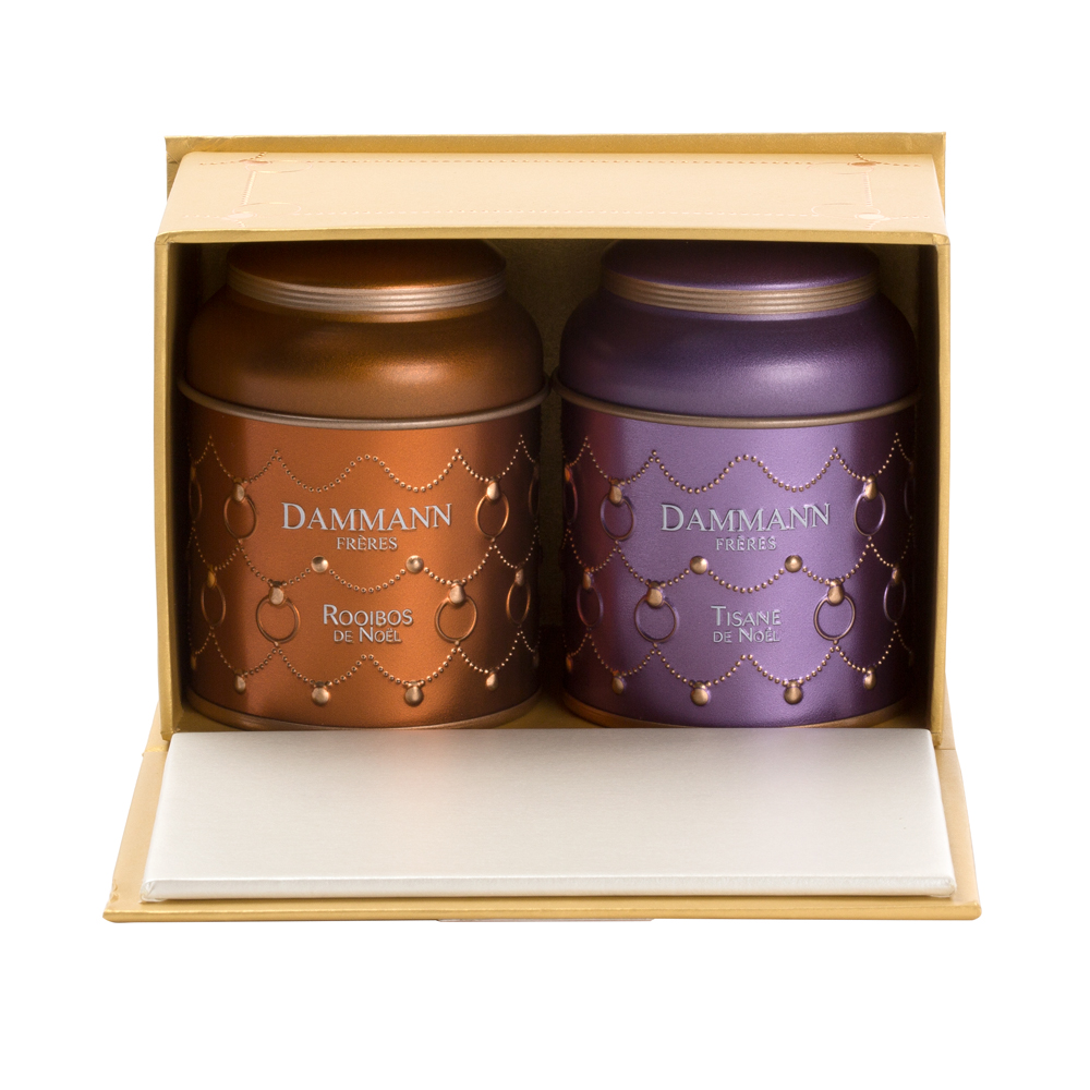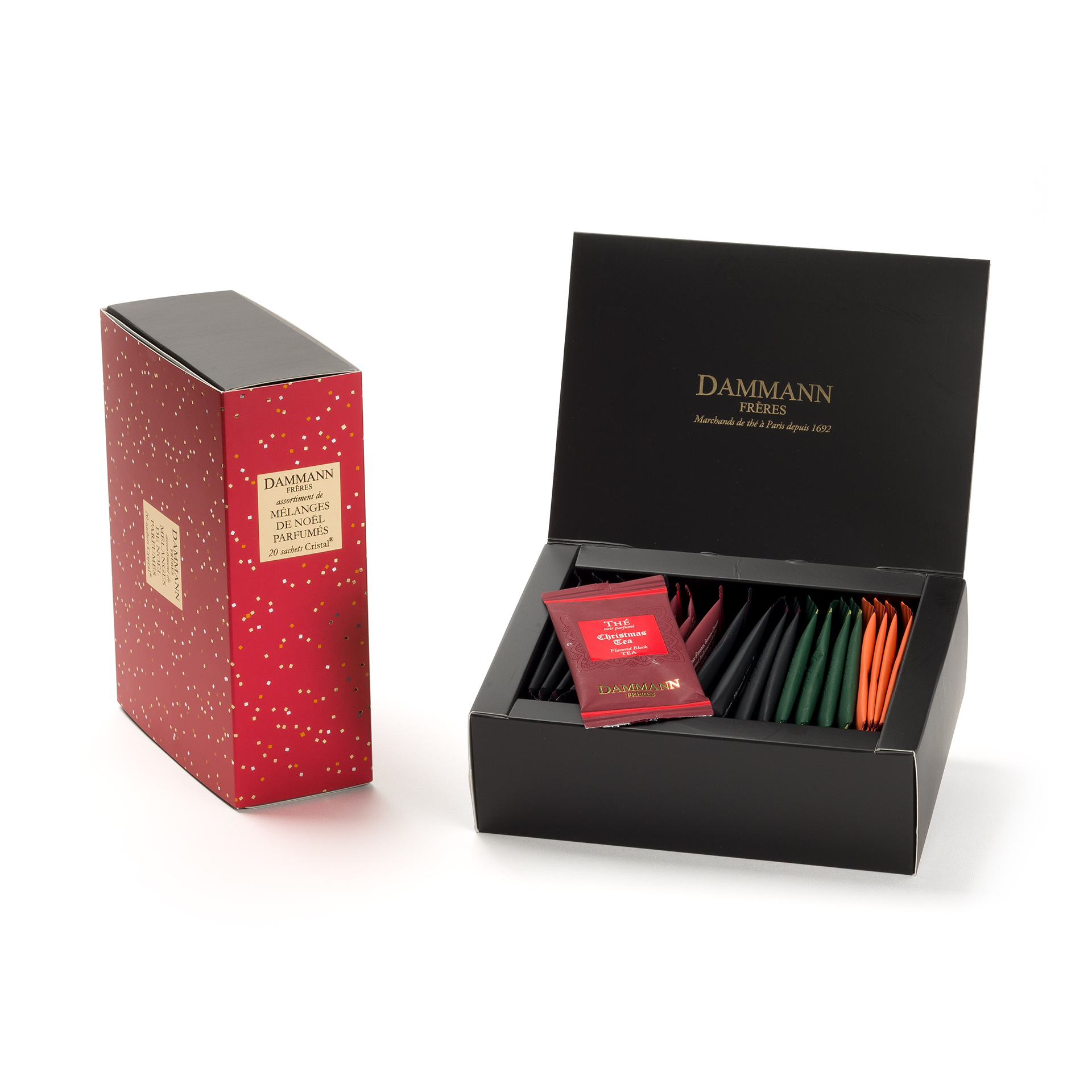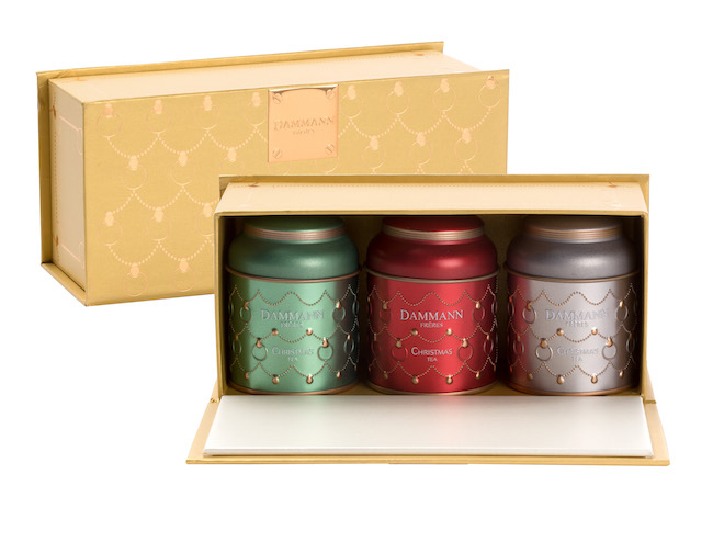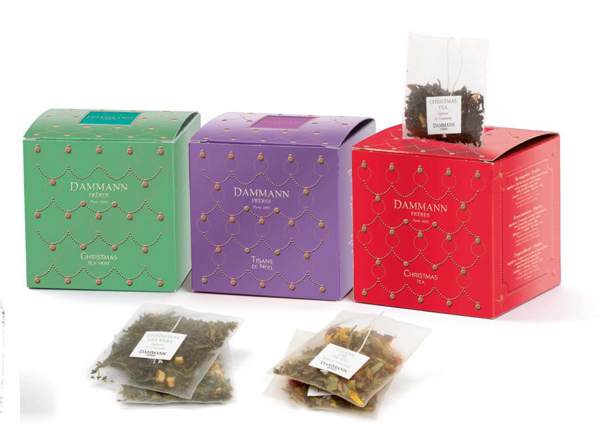Le Christmas tea, thé de Noël est un thé noir parfumé avec de l’ananas, de l’orange et du caramel. Le Christmas tea vert est parfumé avec de l’orange sanguine, de la vanille, de la pomme, de l’amande amère, de la cannelle et du gingembre. De son coté le Christmas tea blanc est parfumé aux saveurs de pain d’épices, cerise, amande et gingembre. Le Rooibos de Noël est à l’orange et aux épices.