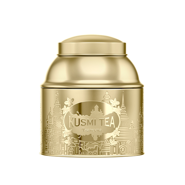 Kusmi Tea : thé de Noël Tsarevna aux notes acidulées et gourmandes : thé noir, écorces d’orange, épices, réglisse, arômes naturels de vanille et d’amande.