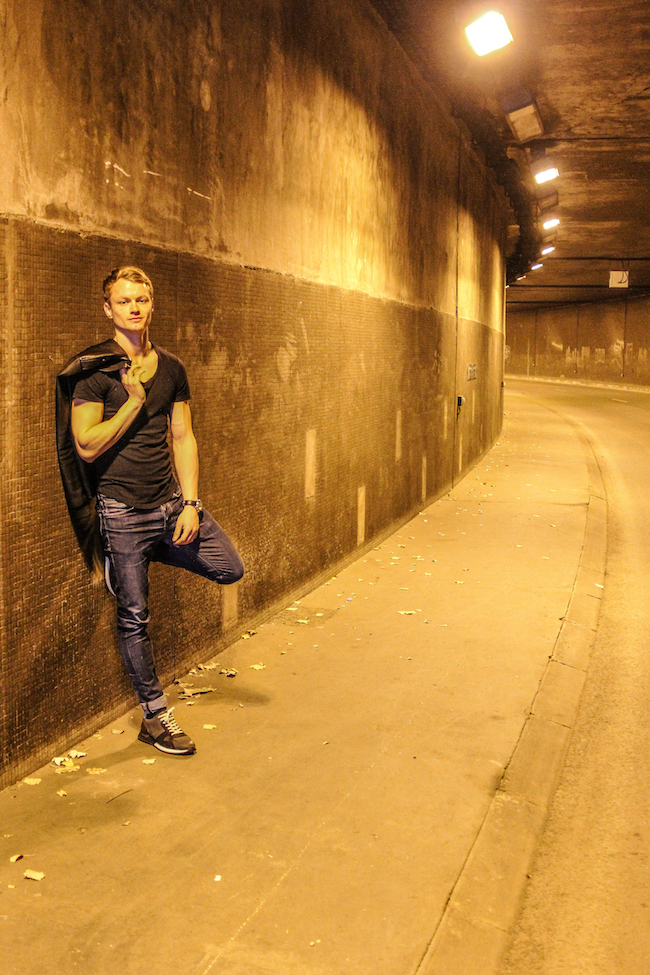 C’était une journée très grise et nuageuse à Paris avec une mauvaise lumière. Il n’était pas évident dans ces conditions de réussir des photos. Alors que nous marchions sur les quais le long de la Seine qui ont été rendus aux piétons et cyclistes, nous avons eu l’idée de faire une photo dans le tunnel, désormais lui aussi interdit aux voitures, qui débouche sur les quais. Il est éclairé d’une forte lumière jaune.