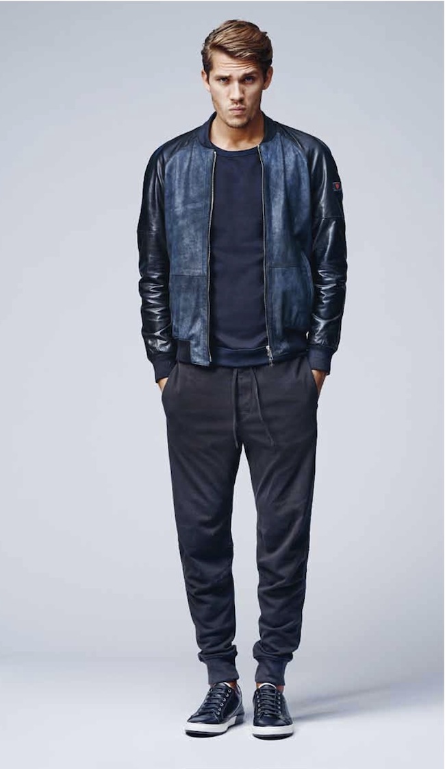 Voici un exemple avec Strellson, porté avec un blouson de cuir qui s’inspire de loin d’un teddy.