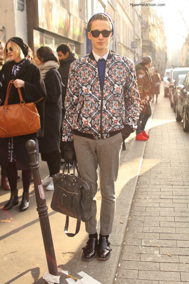 Artem Semenenko, auteur et fondateur du blog www.artemsemenenko.com qui porte une veste Eleven Paris aux motifs très graphiques qui évoquent les années 70, pull Sandro, chemise Zara, pantalon et gants H&M, sac et chaussures Balenciaga, bonnet 21Men et des lunettes Saint Laurent par Hedi Slimane.
