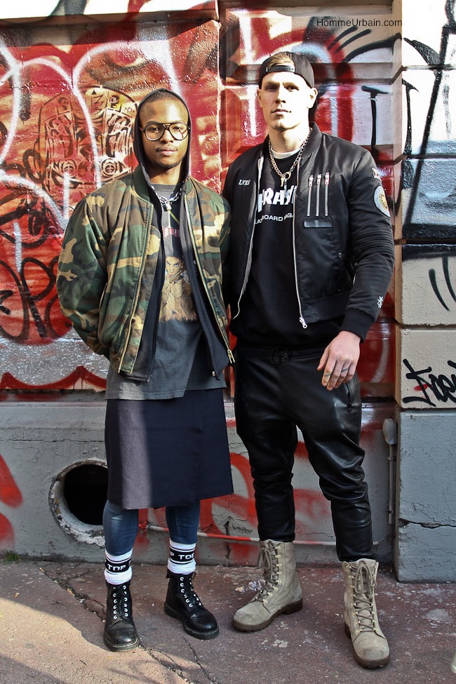 J’aime beaucop ce genre de look qui laisse voir les différentes de couches de vêtements : un T-shirt long sous un bombers motifs camouflage, un jean skinny et une jupe. A droite un look qui me rappelle le milieu des années 90 avec un bombers noir, un pantalon de cuir et des chaussures montantes rappelant les chaussures de montagne.