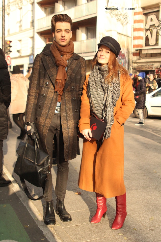 Des ensembles chics et sophistiqués avec pour lui un manteau à carreaux à double boutonnage et fermeture croisée, des gants de conduite, une écharpe nouée de manière originale. Antoine Artus, fashion editor, and blog editor to « Oh my boy » et Jessy Cottineau, stylist, fashion editor et Yishaï Jewelry Designer.