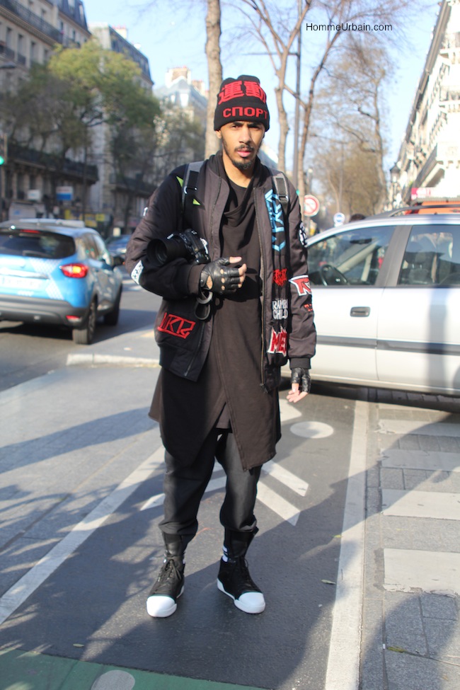 Le photographe Alexandre Gaudin qui porte un bonnet Gosha Rubchinskiy, un bomber KTZ, un pantalon Damir Doma, l’un de mes créateurs préférés, et des chaussures y-3 Yohji Yamamoto.