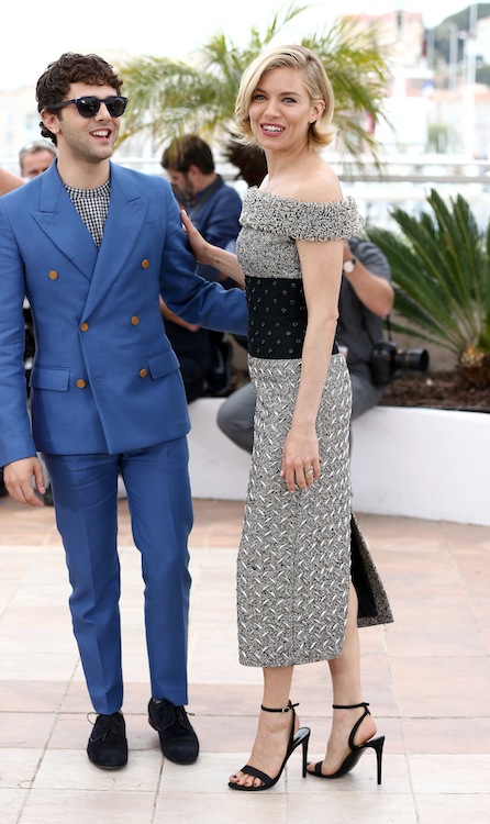 Avec Sienna Miller au photocall en costume bleu à fermeture croisée d’inspiration blazer porté sur un T-shirt à motifs pieds de poule (Photo by Andreas Rentz/Getty Images)