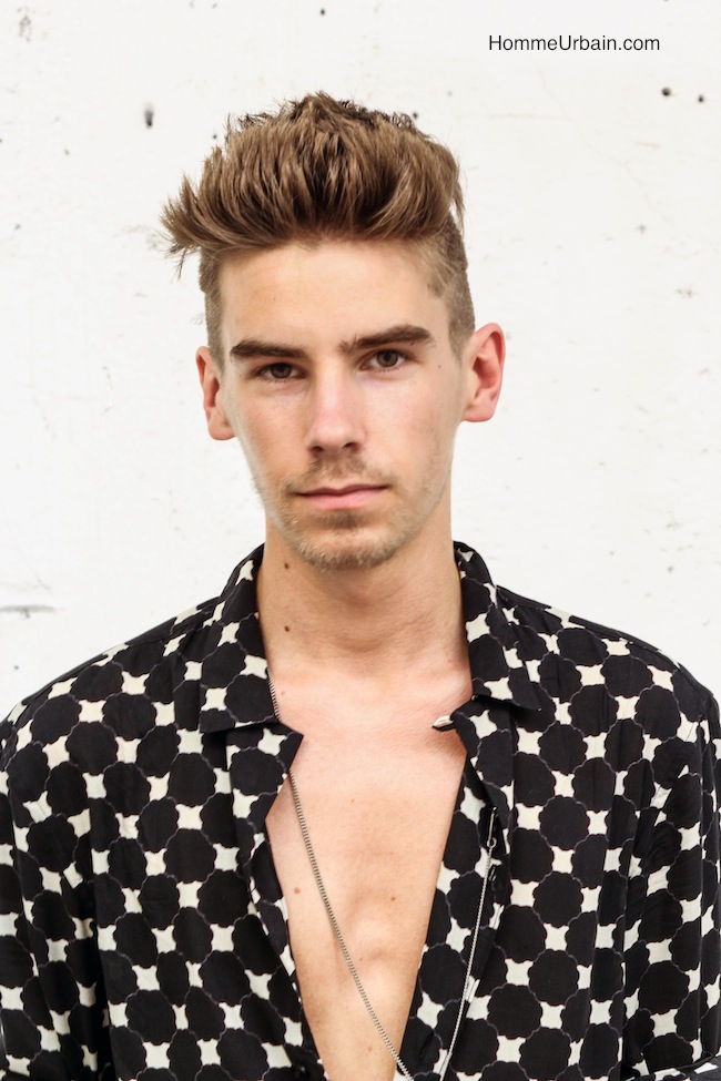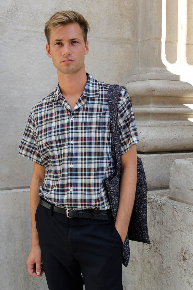 Robin, photographe belge, avec la chemise ouverte comme on l’a vu dans les défilés tout au long de cette fashion week.