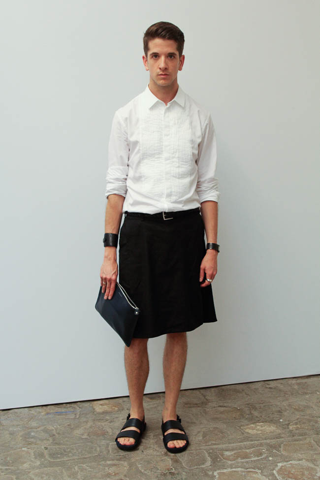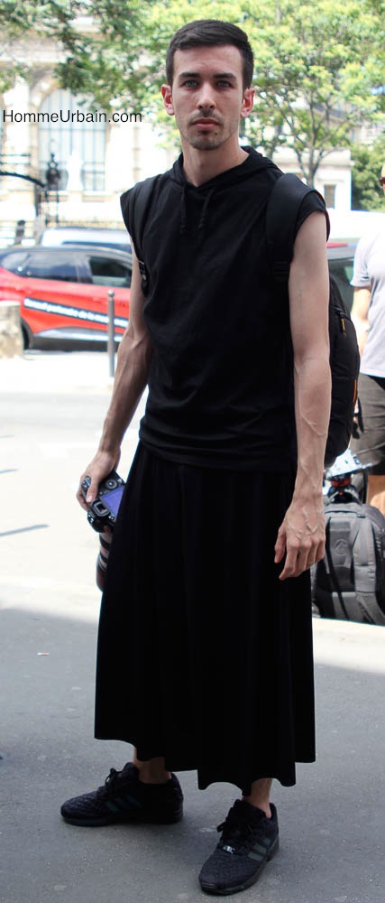 Jupe pour homme, très bien portée, comme un kilt, mais en noir, avec de grosses chaussures.