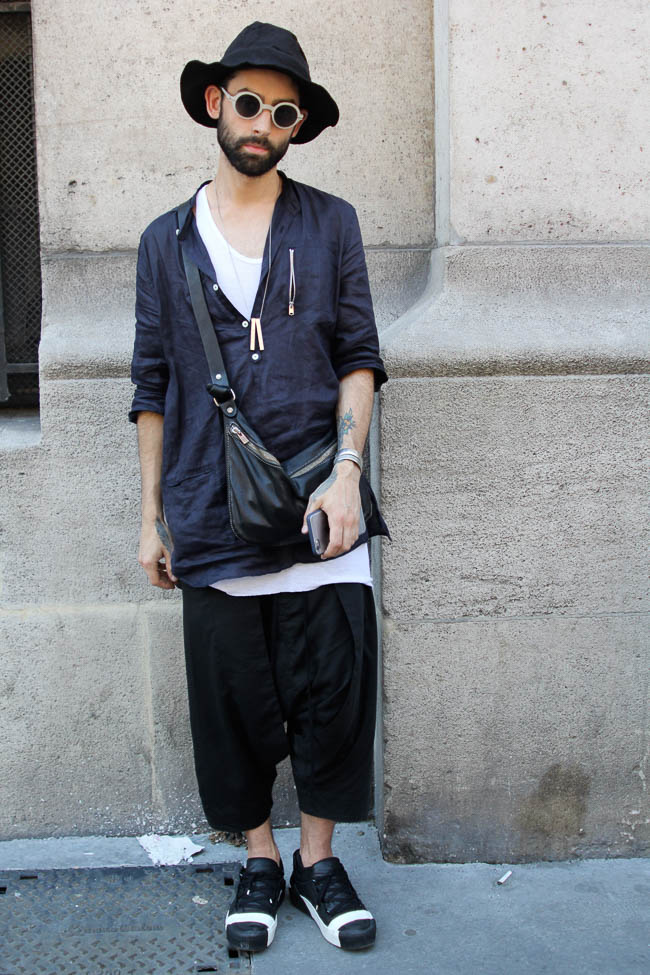 Jeremy qui porte un chapeau CA4LA, des lunettes Mykita, une chemise Nonnative, un débardeur et un short Julius, des chaussures et un collier Boris Bidjan Saberi, un sac Guidi.