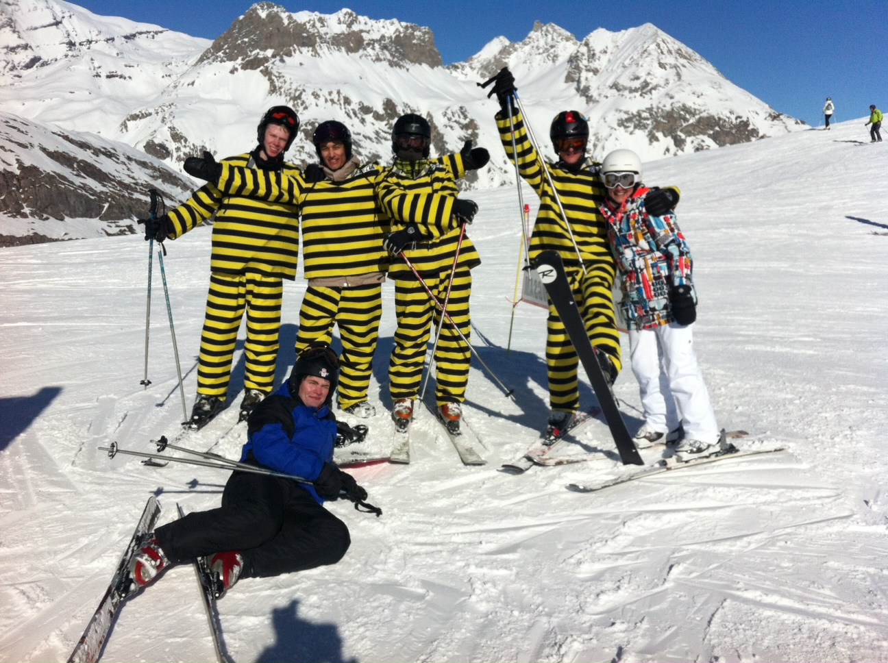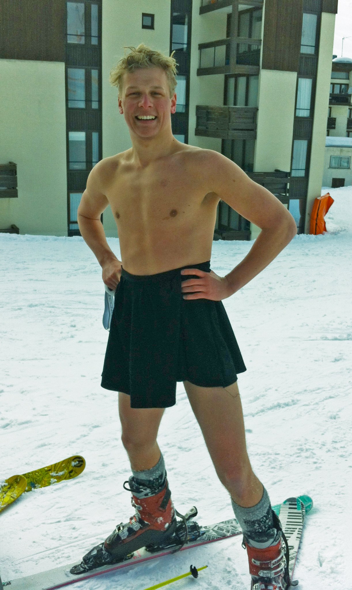 1. Homme en jupe. Mec torse nu en mini jupe (et sans rien dessous) dévalant les pistes à toute allure et entouré de ses amis qui le filmaient.