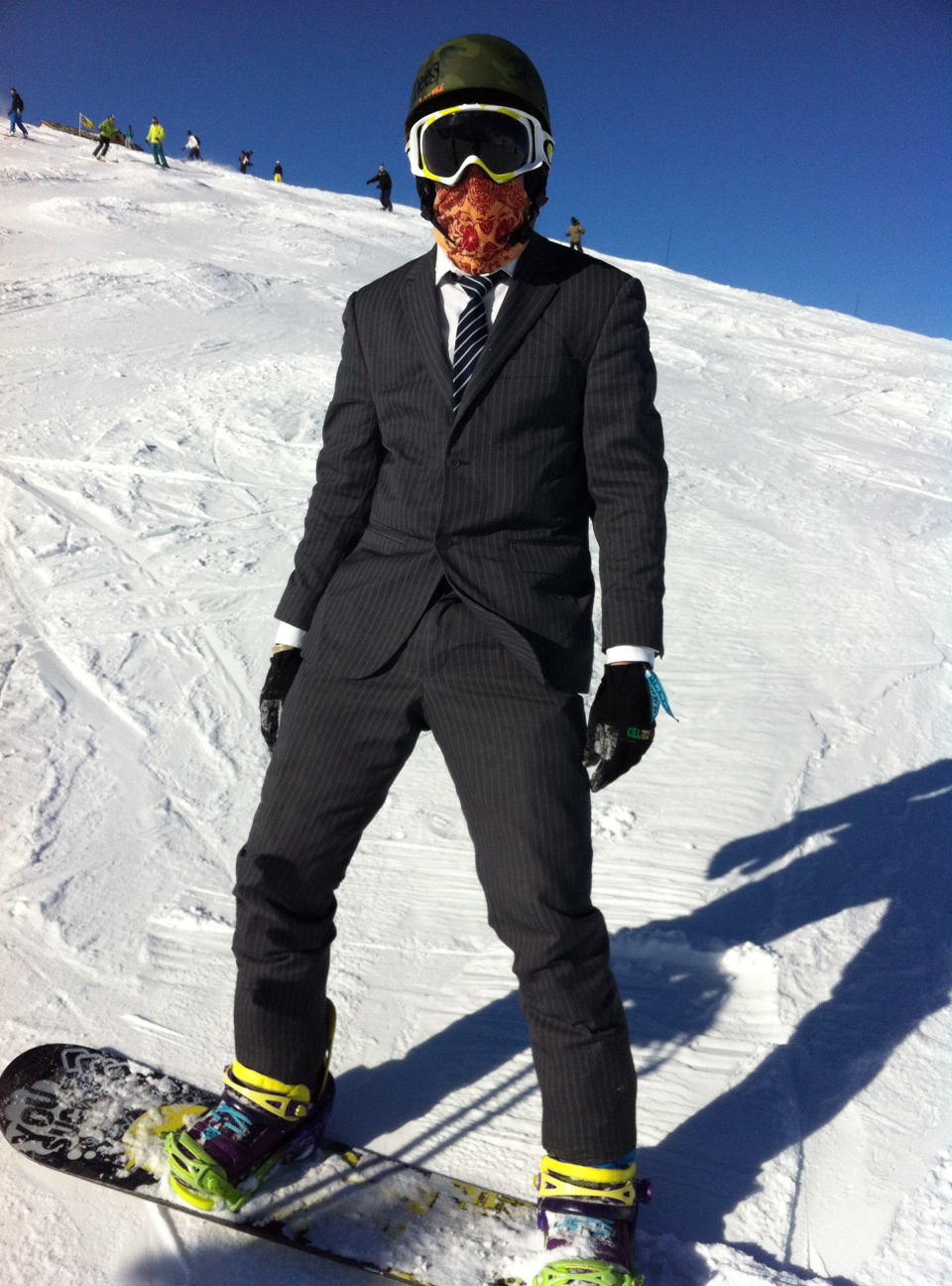2. Costard. Un snowboarder en costume, chemise blanche et cravate.