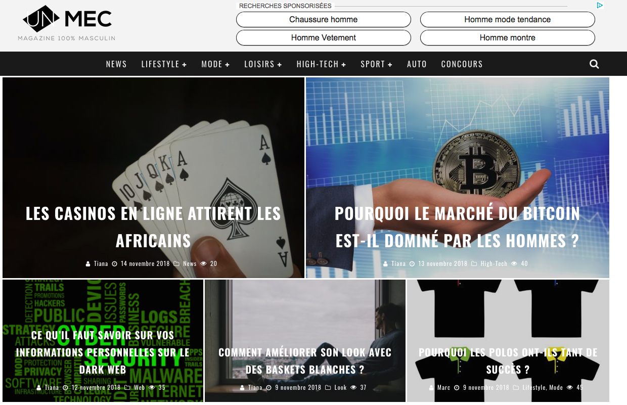 Ce webzine masculin UnMec.fr donne surtout des conseils intemporels. Il fournit aussi quelques actus life style et sur la mode en particulier. Il traite de montres, musculation, séduction, alimentation.