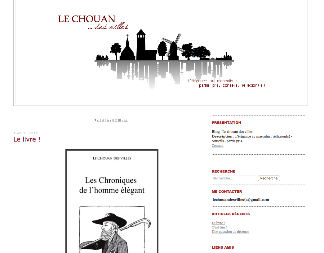 lechouandesvilles.over-blog.com, le blog d’un passionné de l’élégance masculine. Ce n’est pas un blog sur la mode, mais sur l’élégance, nostalgique des habits bien coupés. Il est écrit par un homme qui juge indécent de se montrer en public vêtu d’un T-shirt… A la plume acérée, à l’oeil aiguisé… Malheureusement l’auteur a décidé de l’arrêter en juillet 2015.