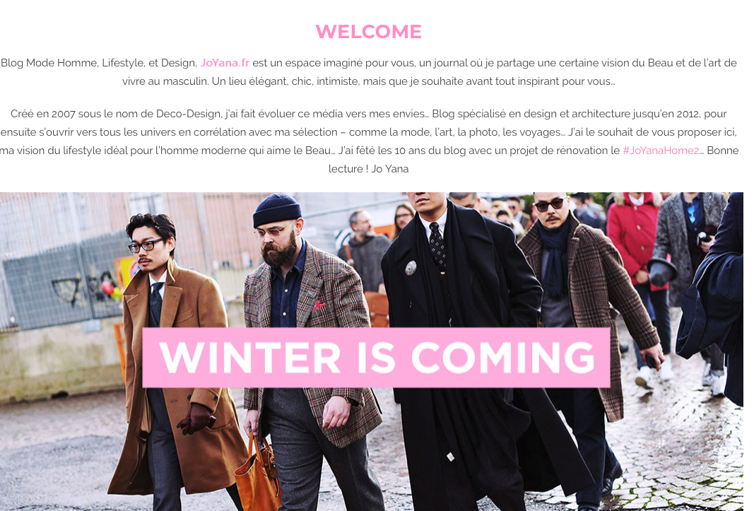 Voici le blog d’un passionné de mode : Jo. Comme il le dit Joyana.fr est un « lieu élégant, chic, intimiste ». Ce blog lifestyle traite aujourd’hui peut-être davantage d’art et de design que de mode.