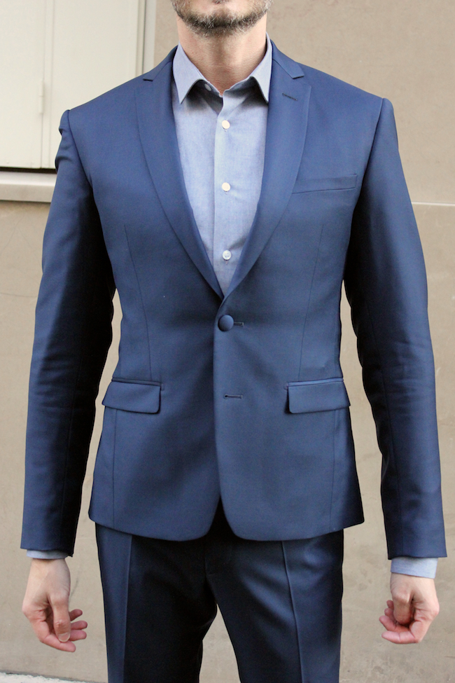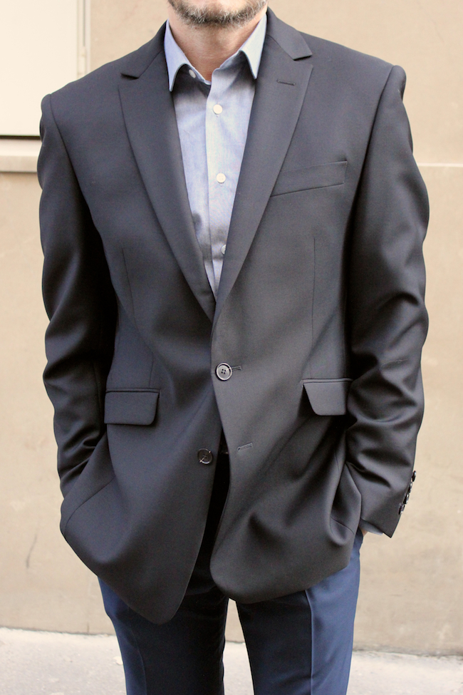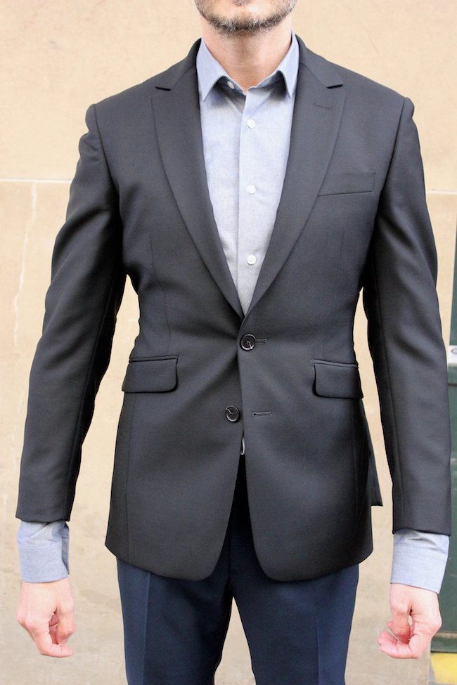 Sur cette photo, la veste est trop petite. C’est flagrant au niveau de la longueur des manches, mais remarquez l’étoile de plis qui se forme autour du bouton et qui indique que la taille est trop petite aussi. Beaucoup de plis aussi sur les manches et du coté gauche de la veste.