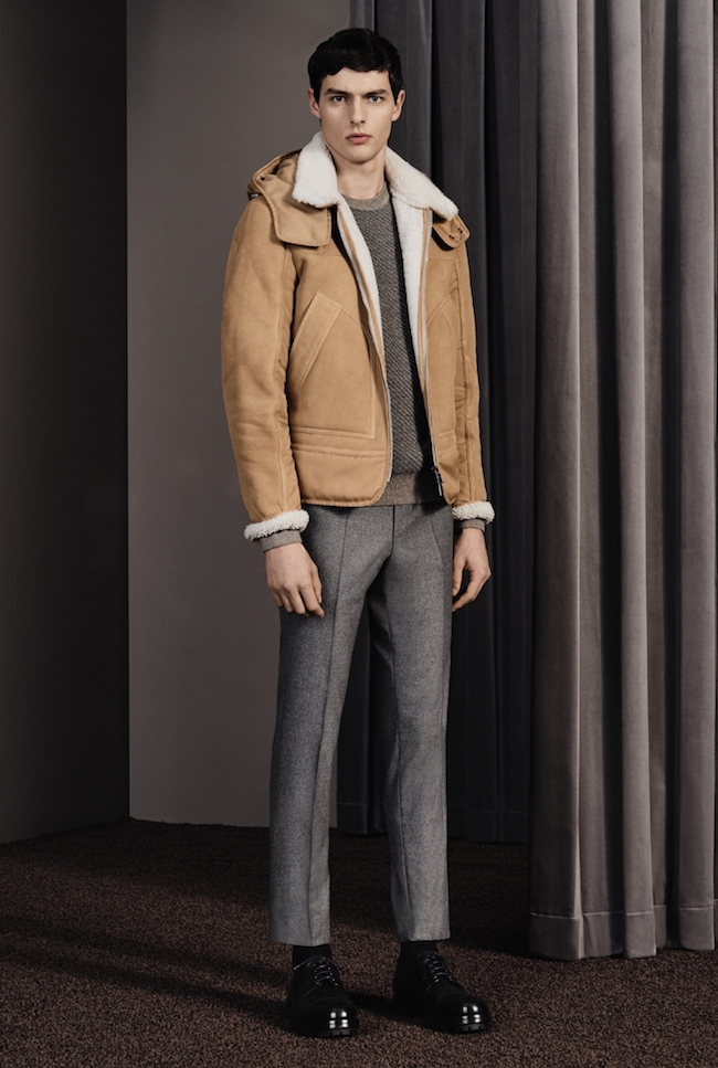 Boss : un blouson en mouton retourné (shearling), avec un pull et un pantalon en laine gris.