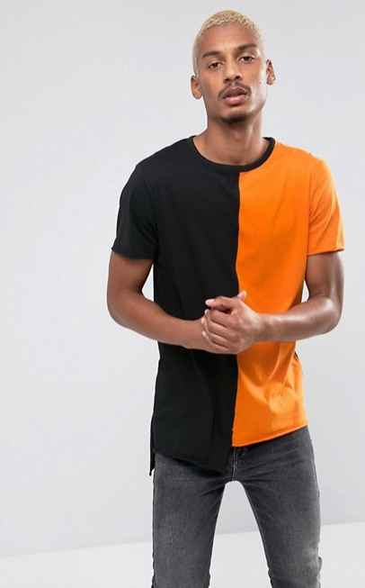 New Look Colour Block T-Shirt noir et orange chez Asos. Une tenue pour se faire remarquer en boite avec l’une des grandes tendances mode actuelle : half half. Un T-shirt avec 2 moitié différentes.