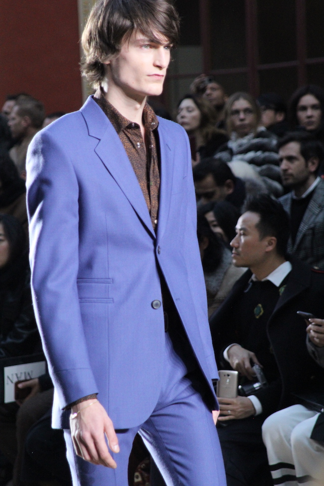 Paul Smith : un costume bleu porté sur une chemise imprimé, marron, avec fermeture par boutons pression