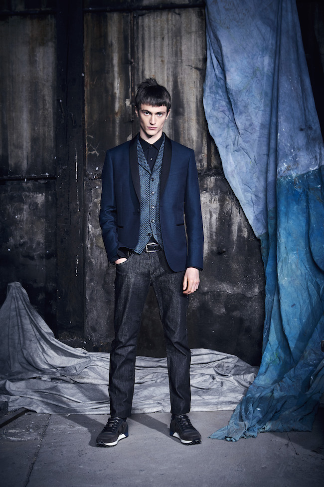 Ungaro : une veste de smoking bleu avec un revers noir portée sur un gilet avec une chemise, un jean et des sneakers.