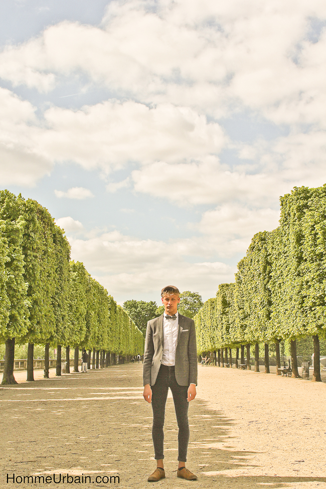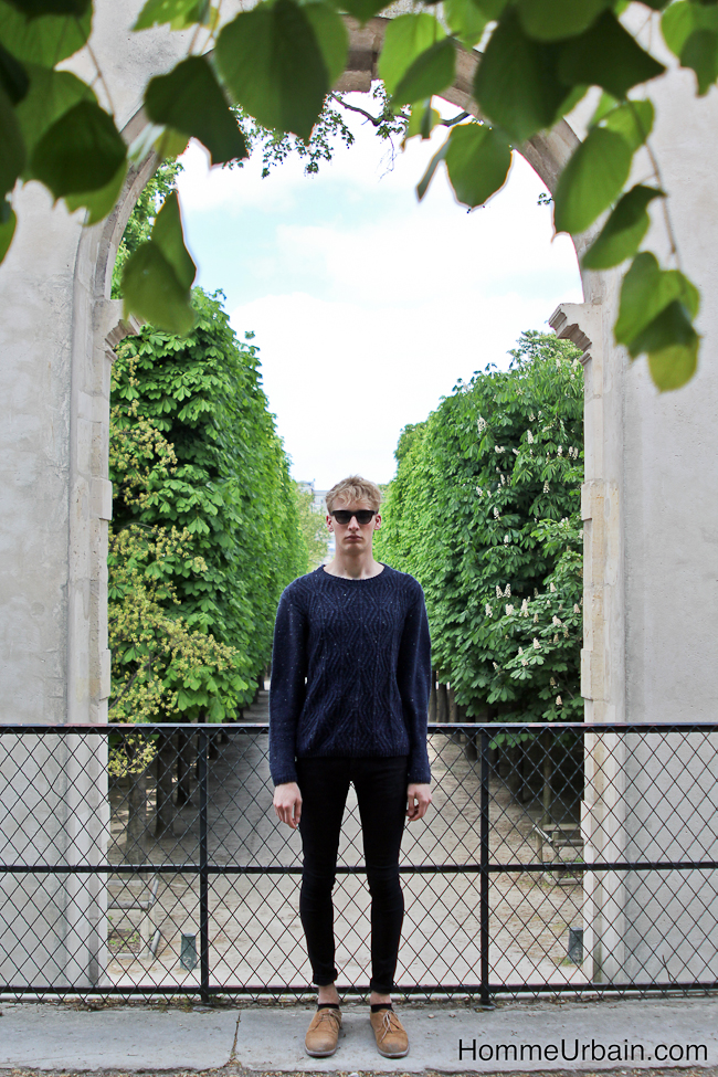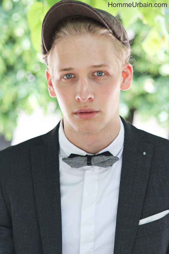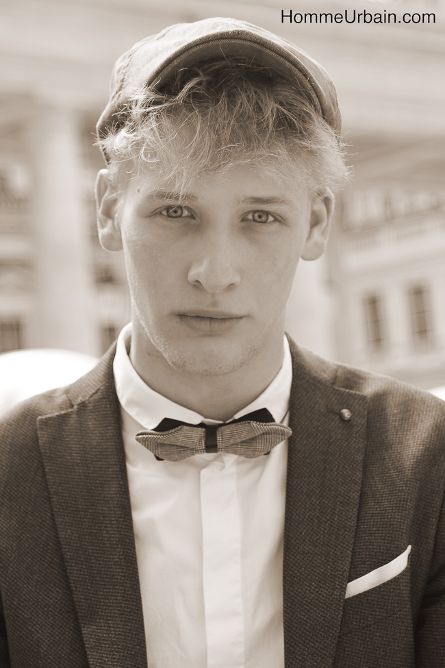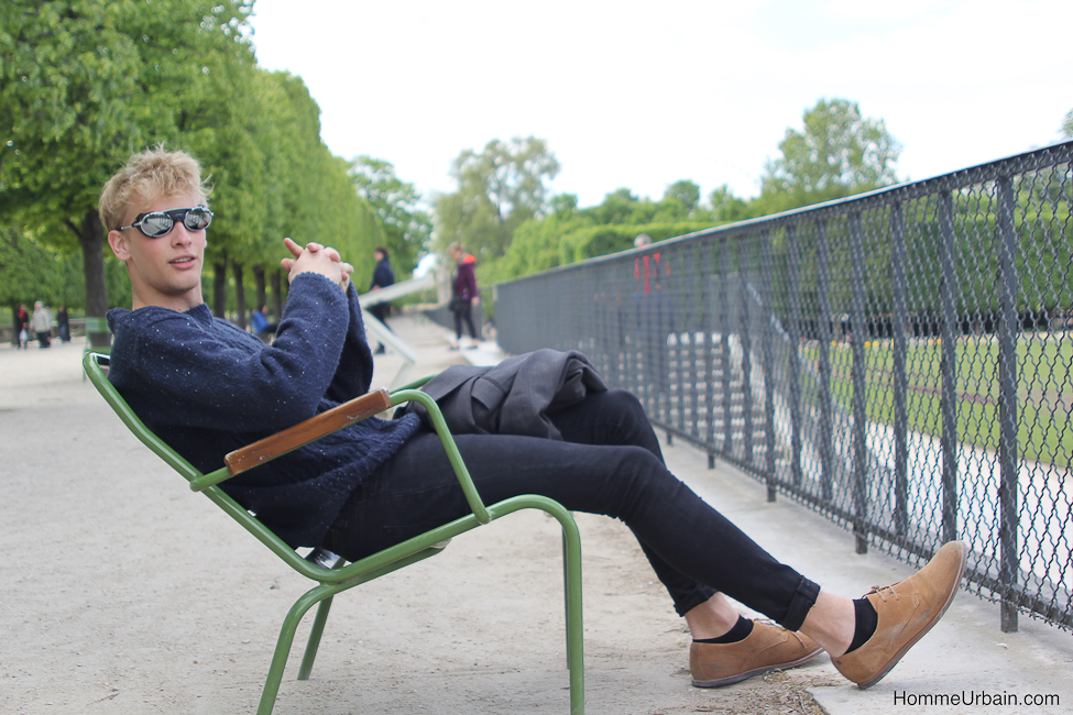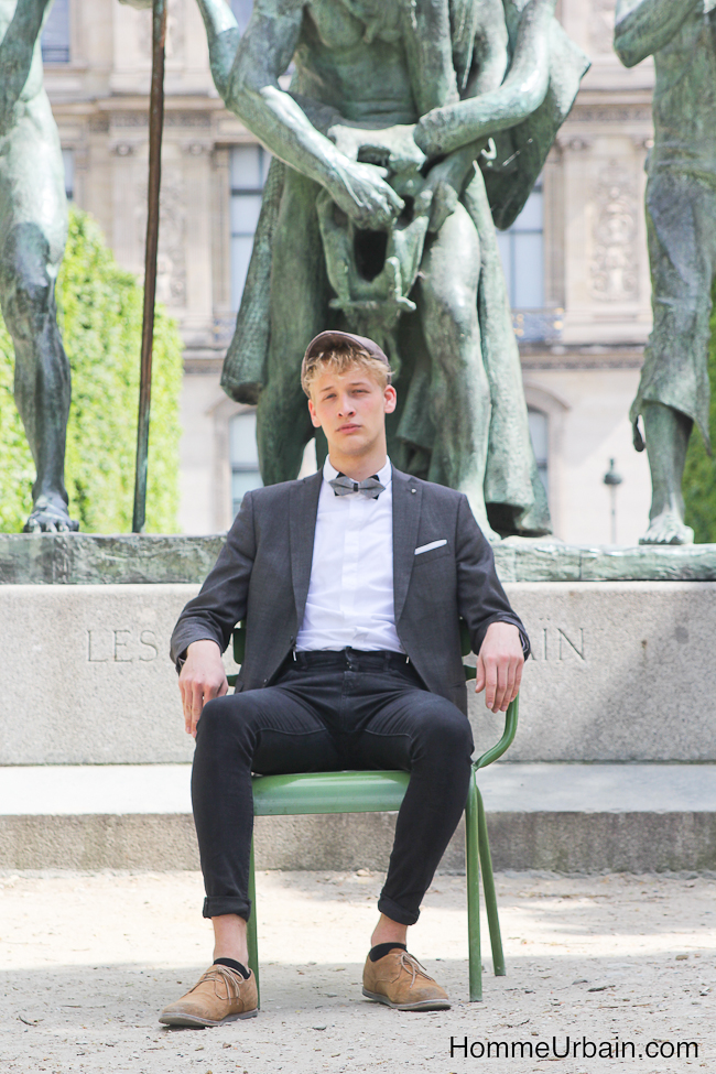 Florian a 19 ans, il est étudiant en design et mannequin de l’agence Karin Models Paris www.karinmodelsparis.com/Men/Mode/1183251/Florian-LANGHEIM. Nous avons fait des photos « street style » dans le jardin du Palais Royal, aux Tuileries et sur les quais de la Seine. La première idée, en contraste avec son jeune âge, était de lui faire porter des accessoires de papy ou un peu désuets : bretelles, casquette en tissu de grand père, noeud papillon, qu’il porte avec une chemise blanche, une veste de costume et un jean noir slim. Sur d’autres photos, il porte un pull chiné et torsadé à même la peau et des lunettes de glacier protection solaire 4.