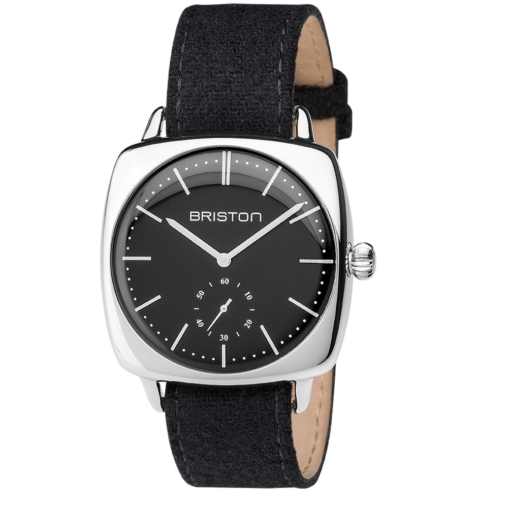 Une montre ronde, mais à la forme «carré cambrée», d’inspiration vintage, empruntée aux années folles. Briston Clubmaster vintage acier, petite seconde cadran noir.