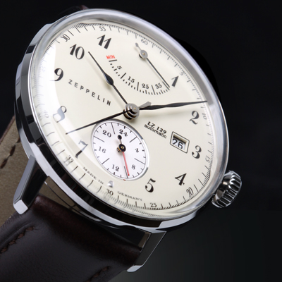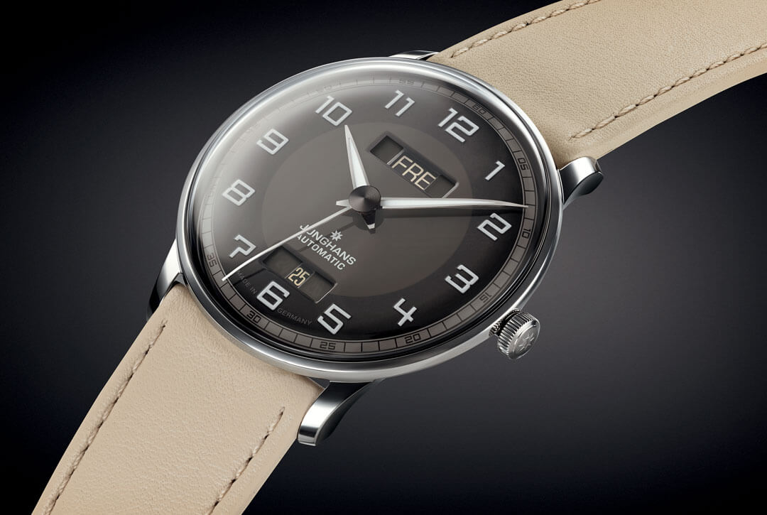 Nombreuses sont les marques allemandes à suivre cette tendance. C’est même la même de fabrique de Junghans qui propose essentiellement des montres dotées de tels verres. Ici un modèle Meister Driver qui s’inspire des tableaux de bord automobile des années 30.