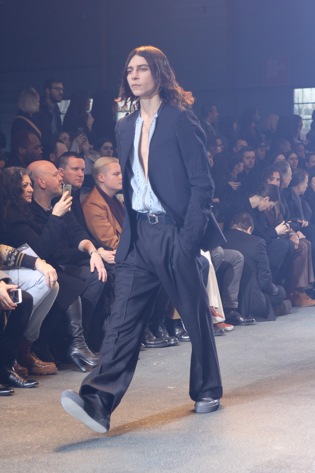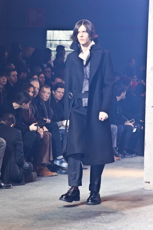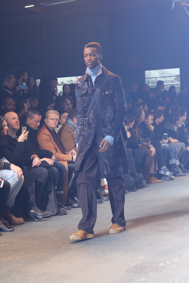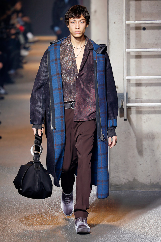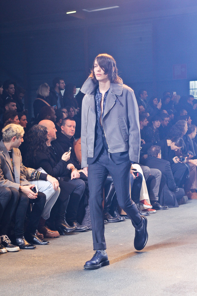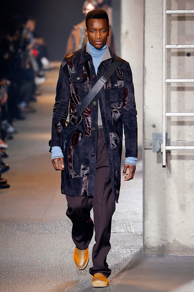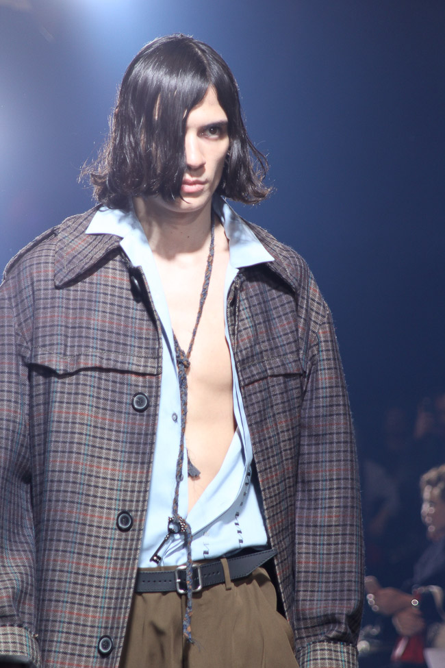« Pour ses dix ans à la direction du style homme de la maison Lanvin, Lucas Ossendrijver a choisi de replonger son regard au cœur de son métier : le vêtement ». Larges surpiqures apparentes, chemises imprimées façon patchwork puis sur-teintes à la main, manches de vestes construites à l’envers au gros fil, ceinture cachée, manteau de fourrure orné d’anneaux de métal et de lanières de cuir ou entièrement monté à l’envers. Le luxe se laisse percevoir dans détails.