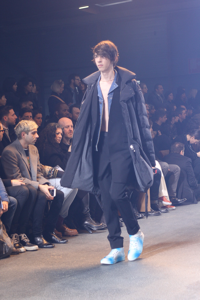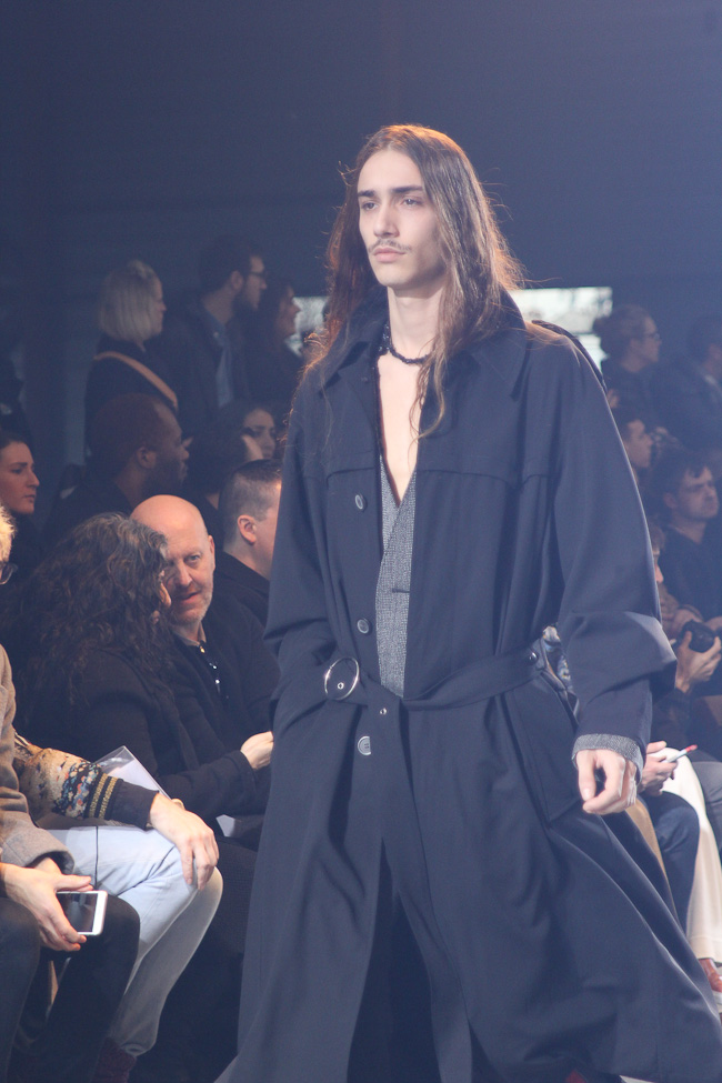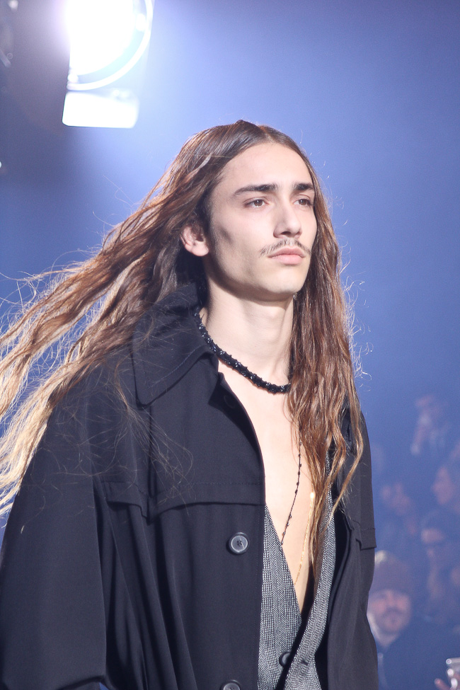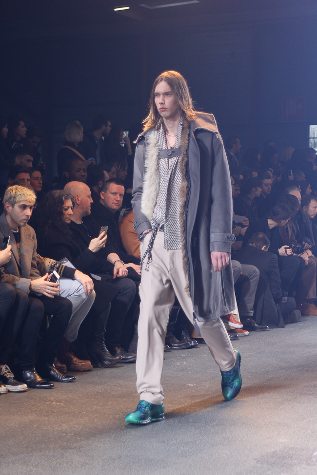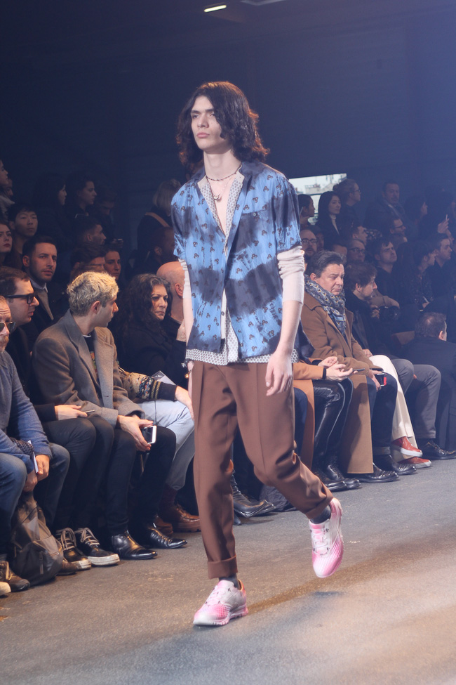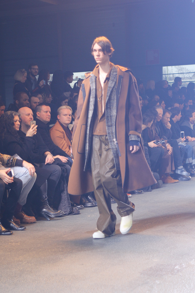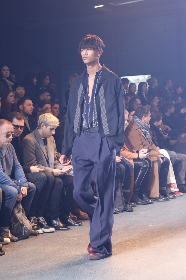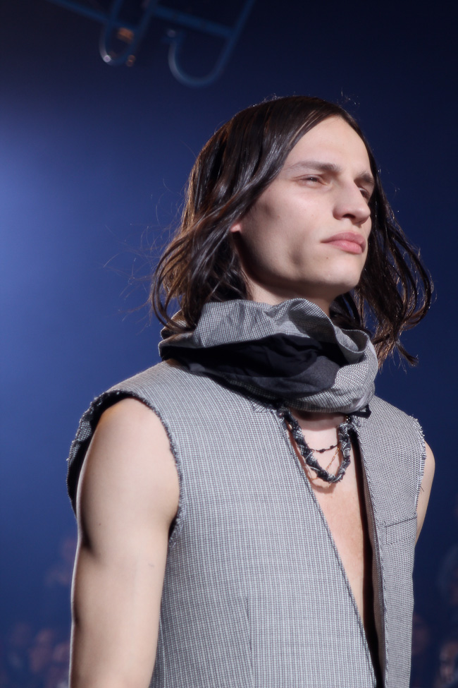« Pour ses dix ans à la direction du style homme de la maison Lanvin, Lucas Ossendrijver a choisi de replonger son regard au cœur de son métier : le vêtement ». Larges surpiqures apparentes, chemises imprimées façon patchwork puis sur-teintes à la main, manches de vestes construites à l’envers au gros fil, ceinture cachée, manteau de fourrure orné d’anneaux de métal et de lanières de cuir ou entièrement monté à l’envers. Le luxe se laisse percevoir dans détails.
