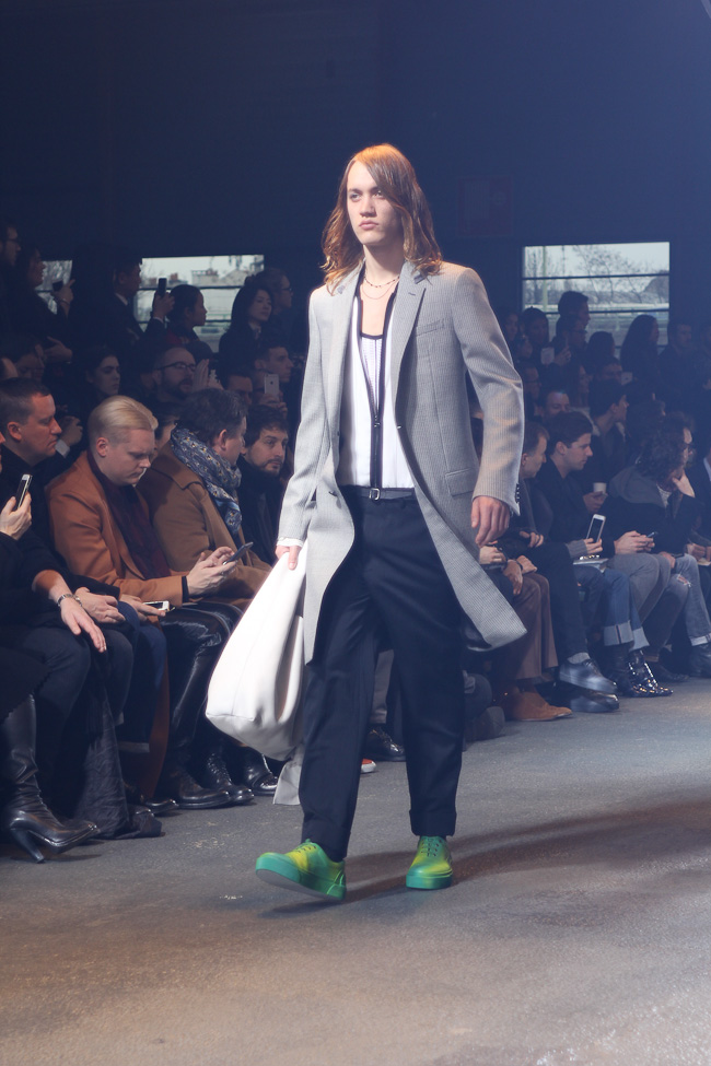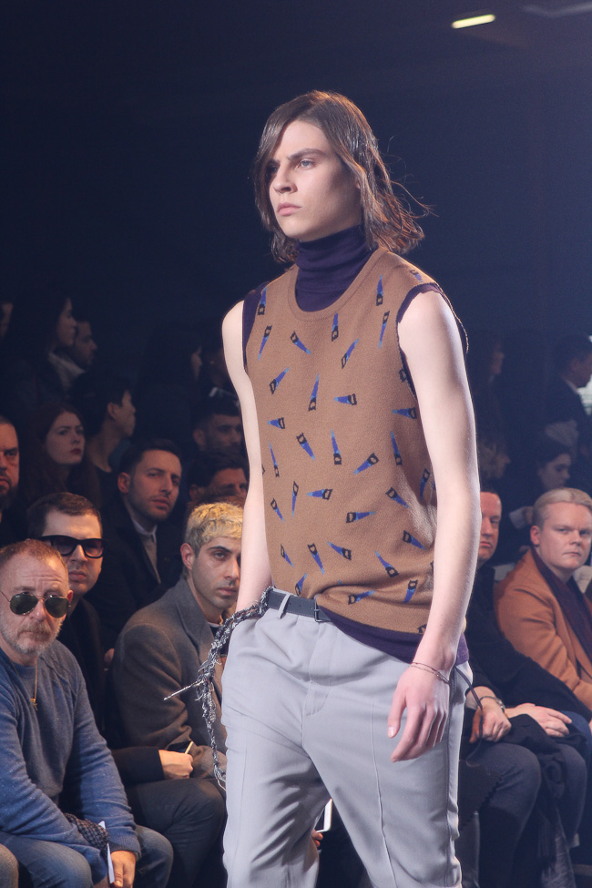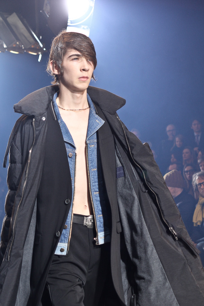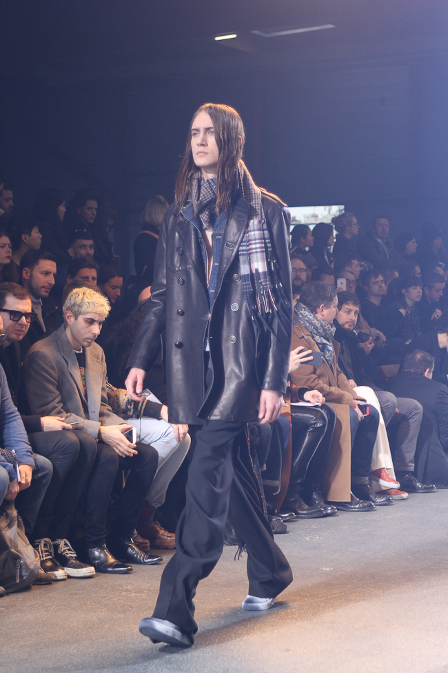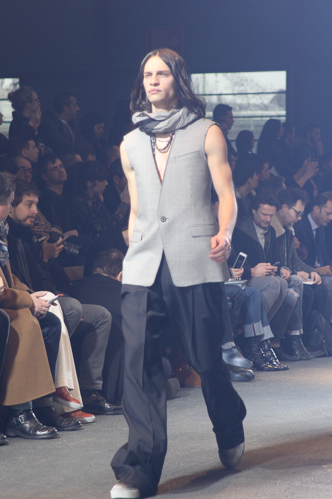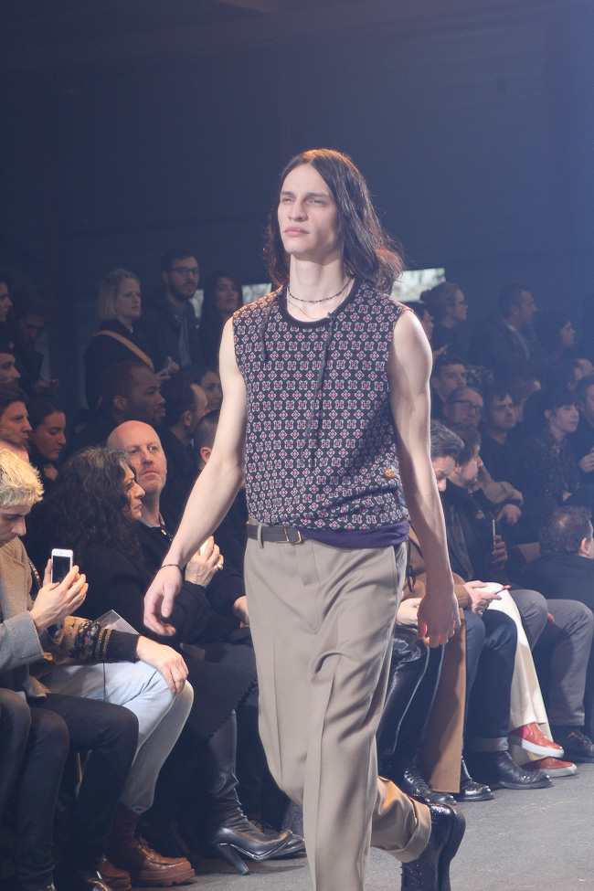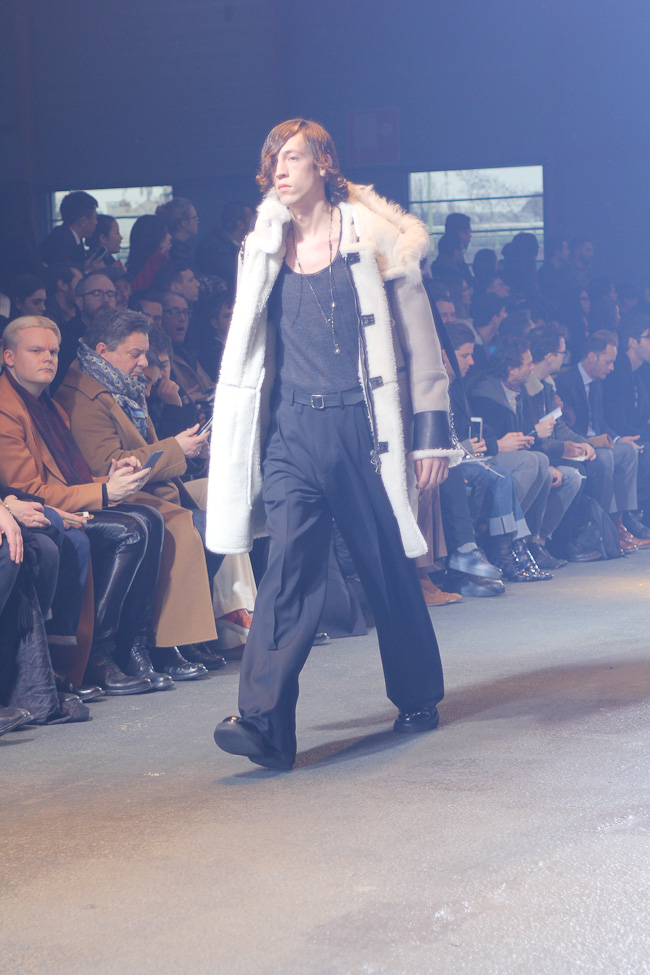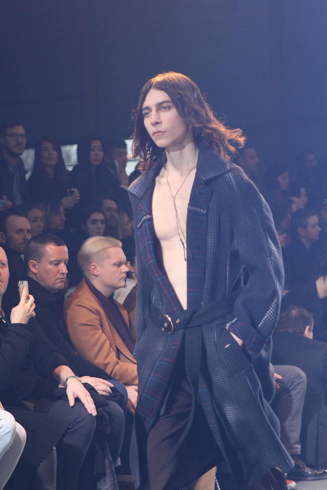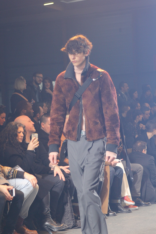 Avec des pulls fins sans manche et des vêtements ouverts laissant apparaître les torses nus, Lanvin table sur un hiver doux : gilet déboutonné, veste en jeans dézipée, chemise ouverte… Parmi mes pièces préférée, un manteau en voile de laine aiguilleté et plissé, construit en double face, imprimé de mini pied de poule et contrasté de carreaux sur la doublure, porté à même la peau juste noué comme un peignoir,…. Les vêtements qui tiennent chaud sont néanmoins présents comme ce blouson orné d’un patchwork de suède et de veau façon poney. Ou un blouson en mouton retourné. Les volumes sont larges, les pantalons amples.