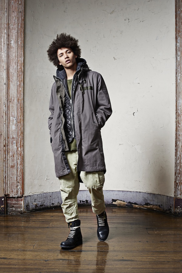 Une propostion assez créative avec une veste portée sur un pull à col châle. Kolor.
