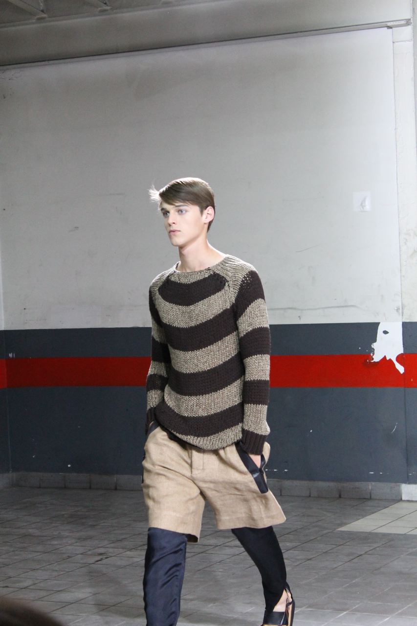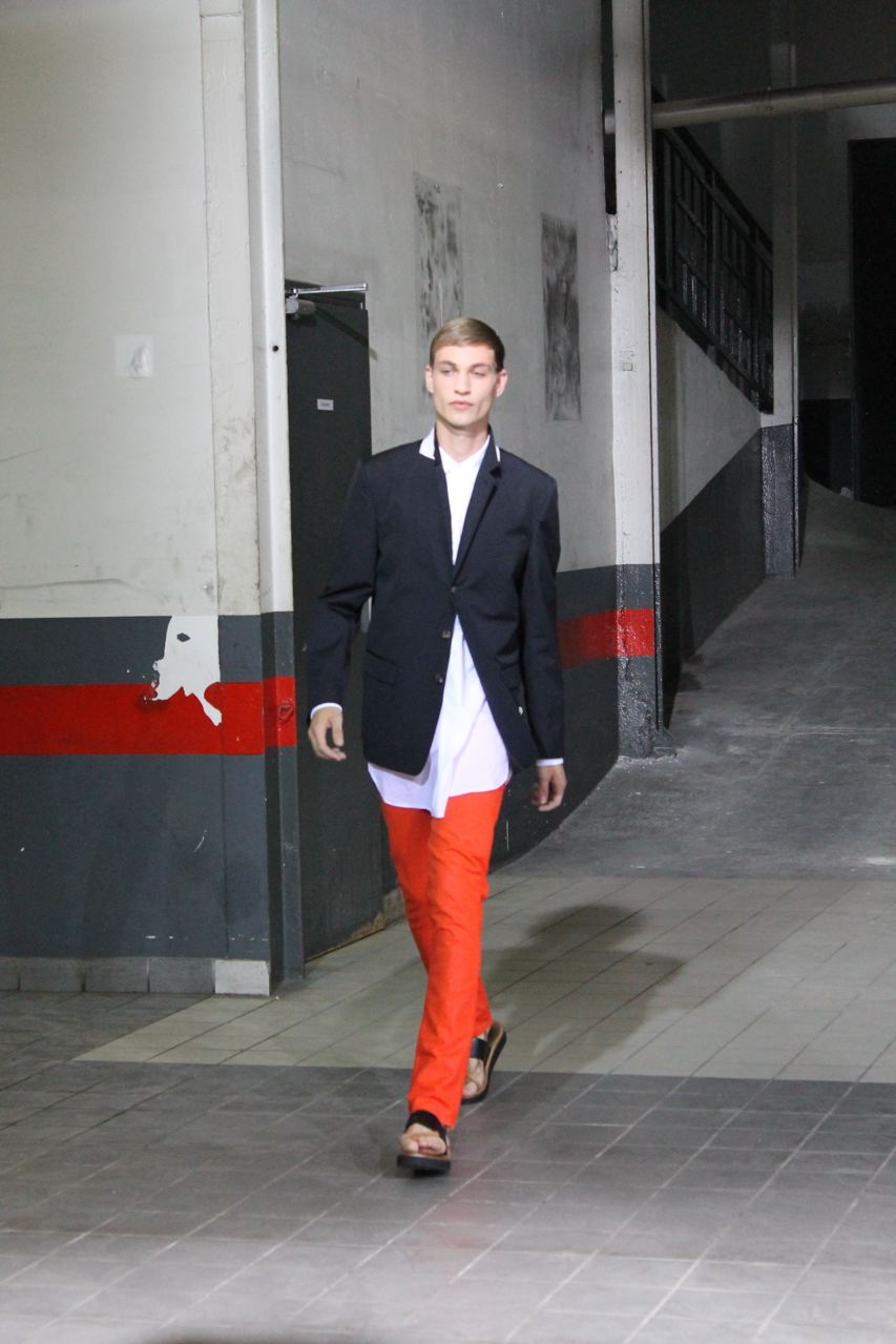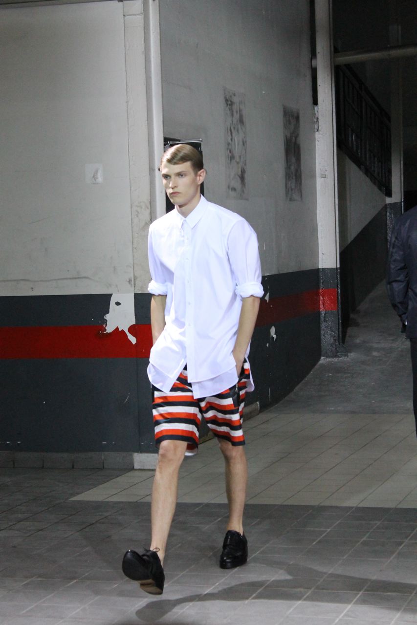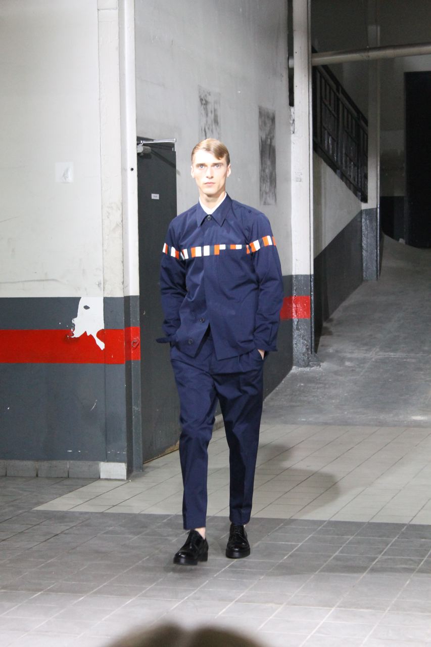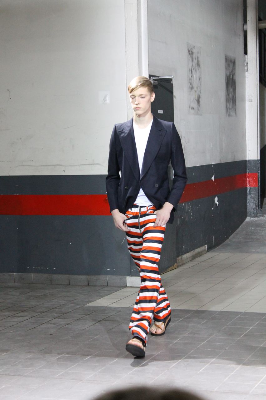 Une cinquantaine de passages pour le défilé prêt-à-porter homme de l’été 2012 de Dries Van Noten. Beaucoup de ton sur ton et de possibles total looks, comme toujours chez le créateur. On retrouve tout au long du défilé des chemises, vestes, pantalons et bermudas coupés dans le même tissus. Pour le show, les pièces ont été dépareillées et sont portées par différents mannequins. Beaucoup de blousons et par dessus en nylon pour un printemps pluvieux dans des tons indigo. Des blousons bicolores : noir avec une partie basse indigo. Des oranges très vifs que l’on retrouve en pantalon, et pull. Des rayures oranges, blanches et noires pour des bermudas, pantalons et chemises. Des chemises blanches zippées ou boutonnées. Des pulls en fine maille très fine, souple et loose.