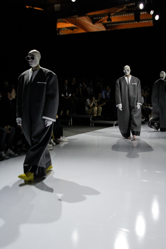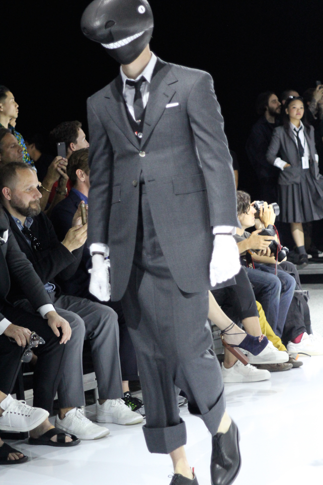 Après avoir pris place au centre, les jeunes hommes sortent de leurs housses comme des papillons d’un cocon pour dévoiler leurs tenues balnéaires ou re-visitant les grands classiques de l’élégance britannique. Thom Browne nous fait une nouvelle fois une démonstration de son savoir faire. Un homme vêtu de noir tel un homme grenouille passe les apprêter un à un avant qu’ils ne rejoignent la piste faire un tour bousculés par le requin et par quelques volatiles : mouette, cormoran, puis un perroquet de type aras.