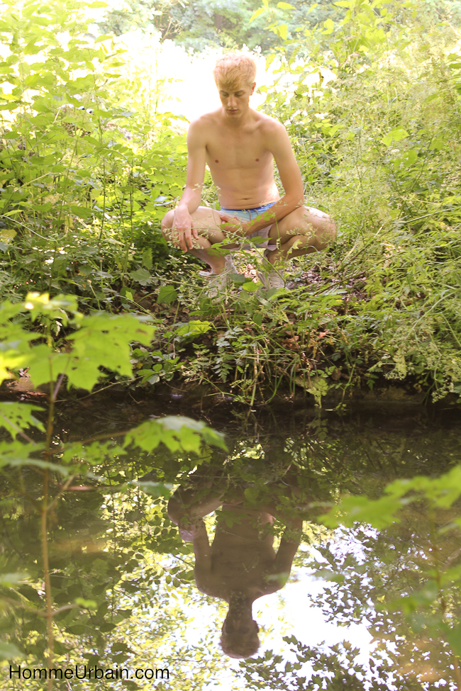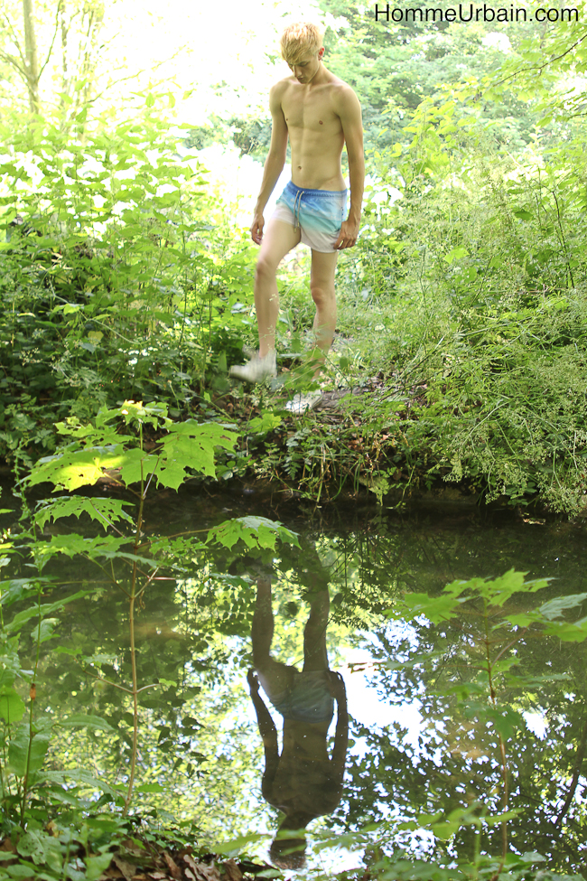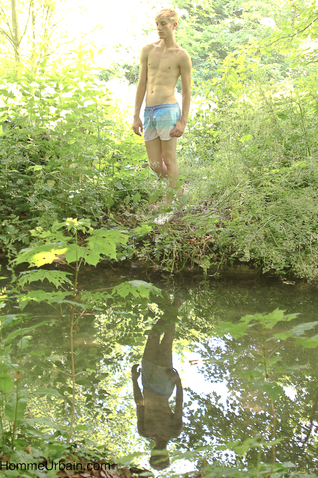 Changement de tenue au bord d’un ruisseau du Bois de Vincennes. Il est habillé d’un short de bain à 3 bandes horizontales. Les photos s’inspirent du mythe de Narcisse, chasseur demi-dieu, qui contemple son reflet dans l’eau.