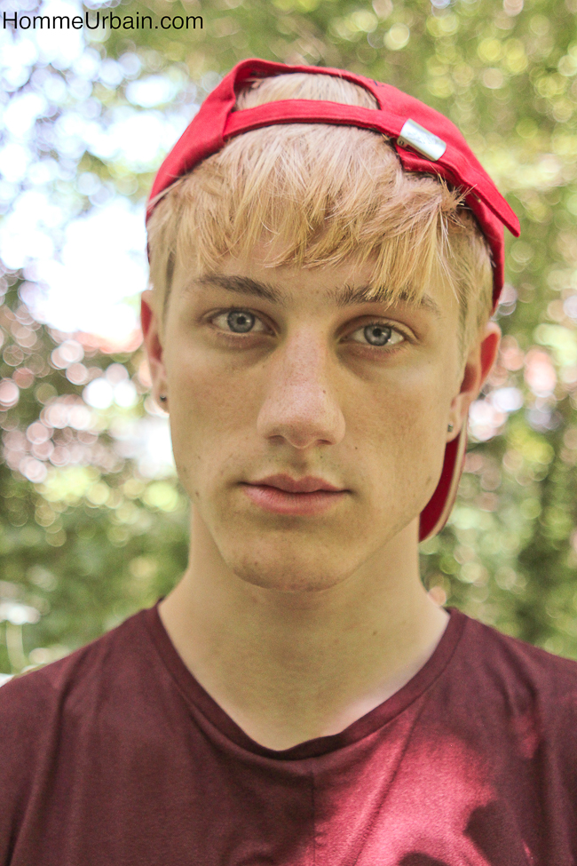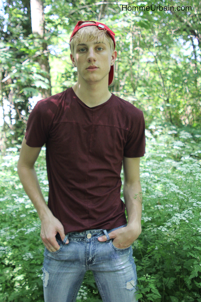 Tout autre style, avec un look plus « skater californien »: Il porte un jean usé, taille basse, avec un T-shirt bordeaux à col rond et une casquette de baseball rouge.