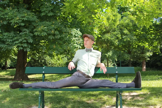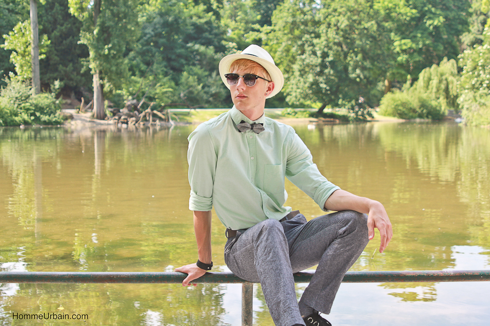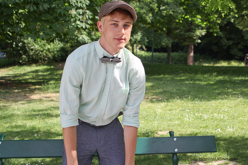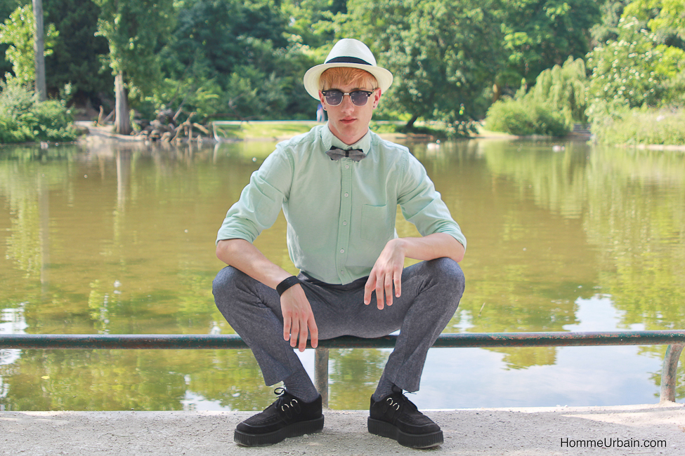 Nous nous sommes d’abord amusés à lui donner un look d’antan. Celui d’un jeune homme du 20ème siècle se rendant à quelque guinguette de bord de Marne. Dans la première série de photos, il porte différents accessoires rétro comme un chapeau trilby de papier, des lunettes de soleil de type clubmaster et un noeud papillon. C’est une forme apparue dans les années 50 et donc associées au mouvement rockabilly. Comme vêtements, il porte une chemise pâle couleur vert amande et un pantalon classique de type chino gris chiné en lin tenu par une ceinture de cuir marron. Sur d’autres photos, il est coiffé d’une casquette de pépère, typiquement française. Il est chaussé de chaussures sneakers noires à grosses semelles, « platform shoes ».