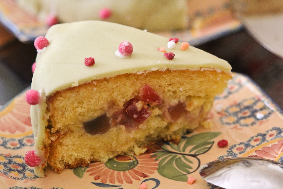 Il s’agit d’un gâteau le plus souvent de forme ronde, formé de deux génoises, avec entre elles une crème pâtissière à la vanille et aux fruits confits marinés au kirsch. Le tout recouvert d’une pâte d’amande. L’origine précise de ce gâteau n’est pas connue. Mais la Maison Bettant à Villeurbanne, dans le grand Lyon, le présente comme une recette familiale et traditionnelle depuis la fondation de cette pâtisserie en 1935.