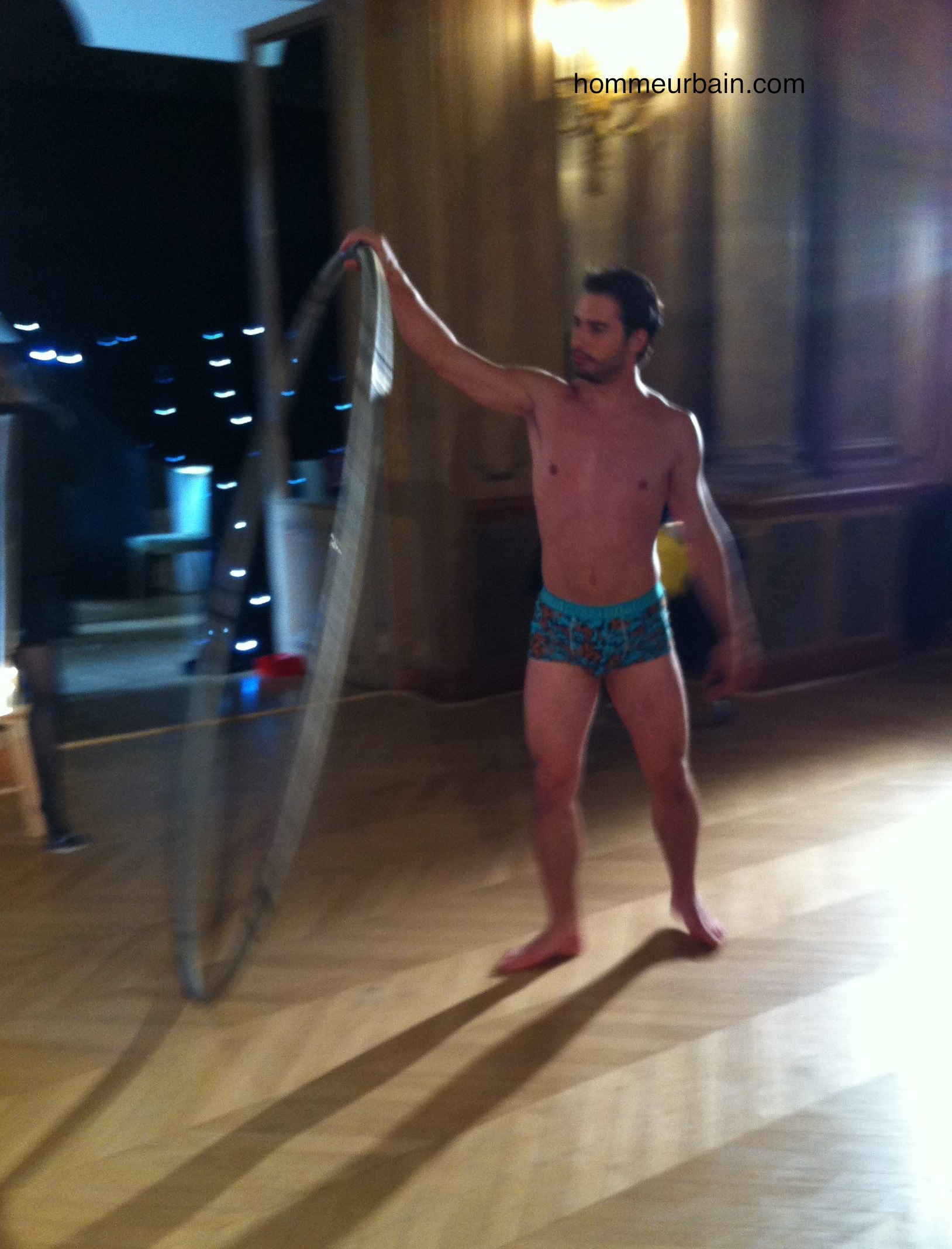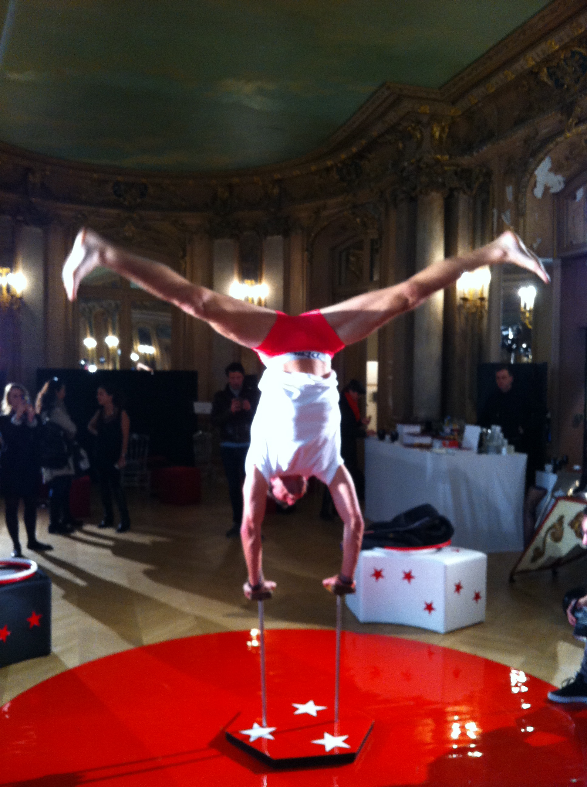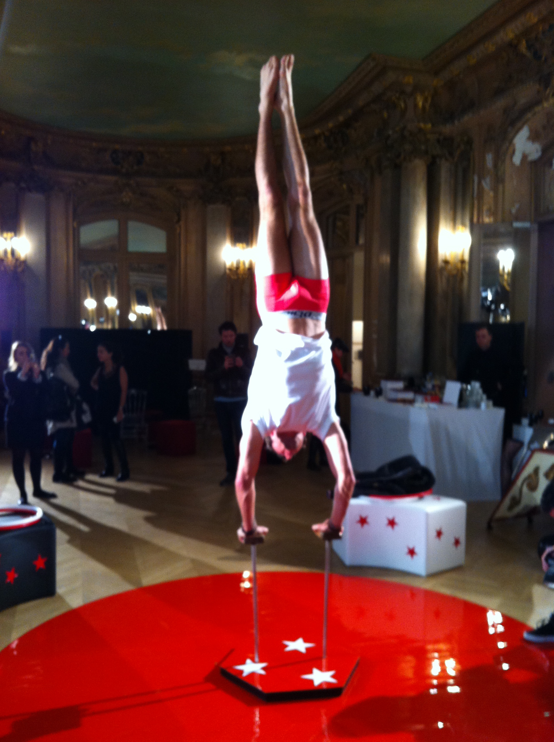Dim présente une collection sur le thème du cirque. J’ai pris quelques photos lors de la présentation presse, avec jongleurs, trapézistes, acrobates, magiciens et charmeuses de serpents, mais avec mon iPhone, elles sont donc toutes floues… Des boxers unis, noirs, rouges et bordeaux.