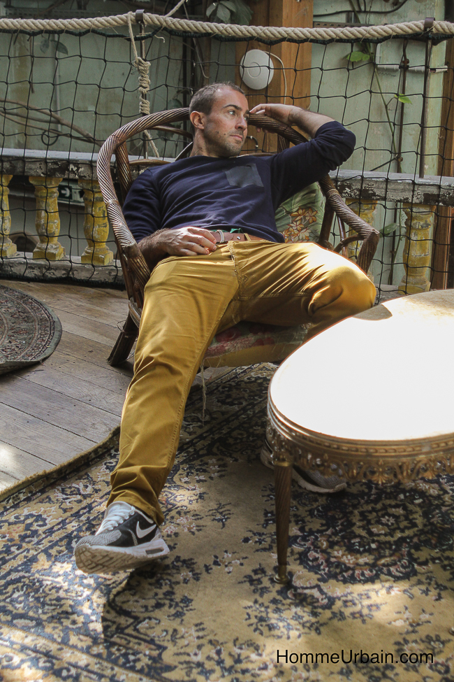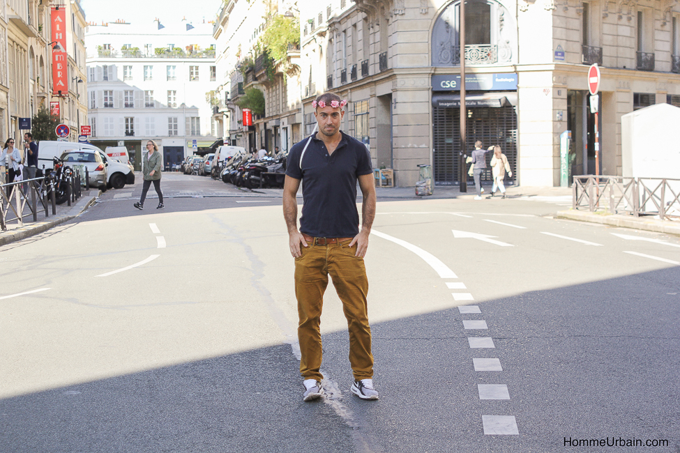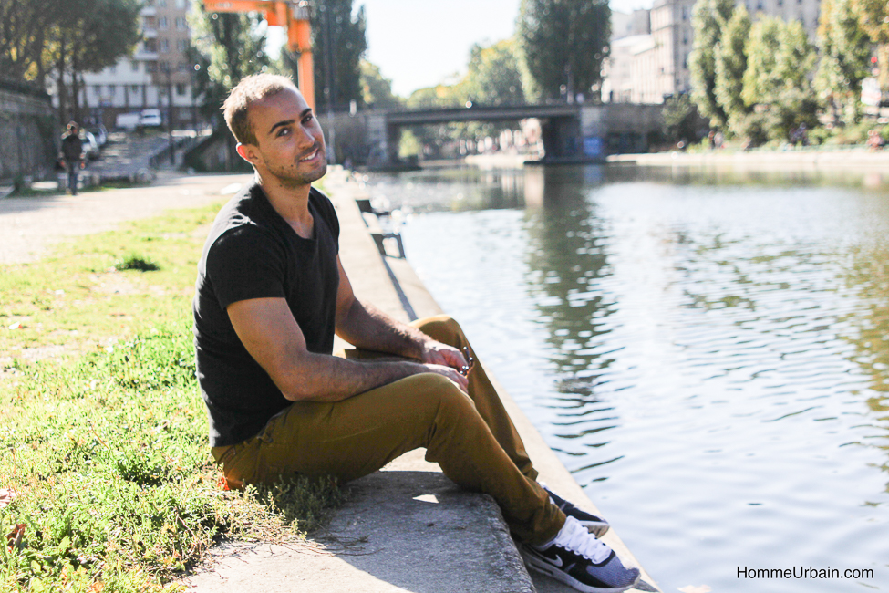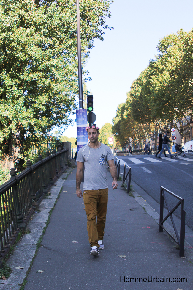Ces photos datent du 14 octobre. Ce dernier jour de soleil et chaleur de l’année semble remonter à beaucoup plus longtemps tellement les températures ont baissé. Avec Gérald, nous nous sommes retrouvés le long du canal Saint Martin pour faire les photos. Je lui avais juste demandé de prendre quelques T-shirts et un accessoire original qui pourrait apporter un côté décalé aux photos. Il est venu avec une couronne de fleurs :D. Sinon, il porte un jean couleur safran.
