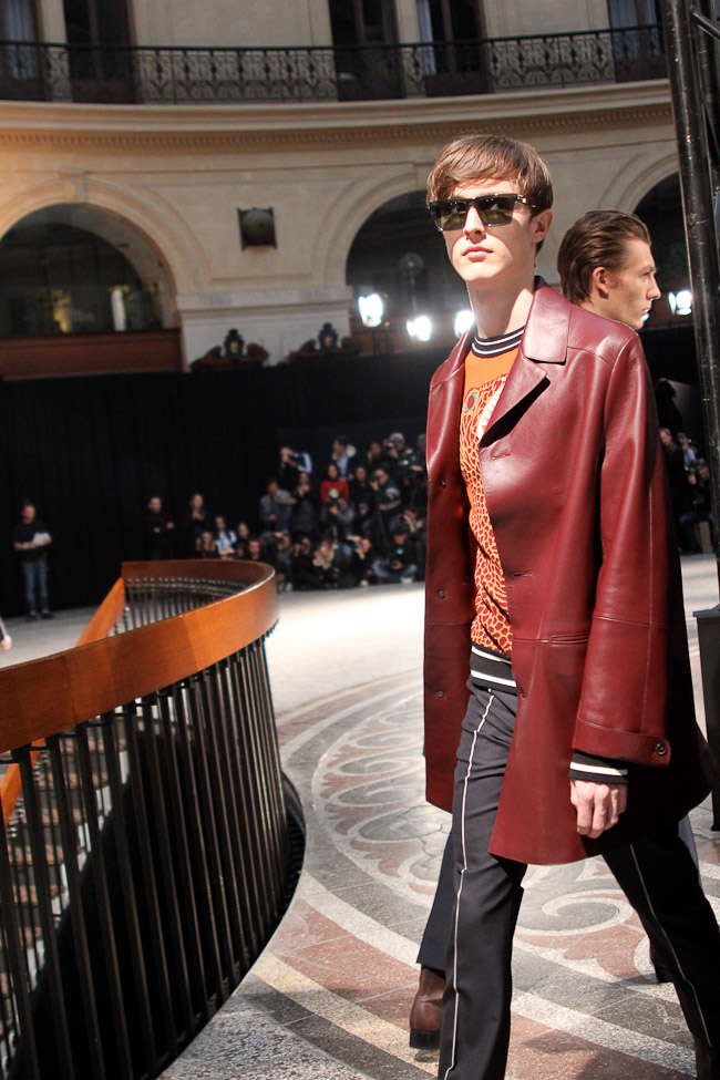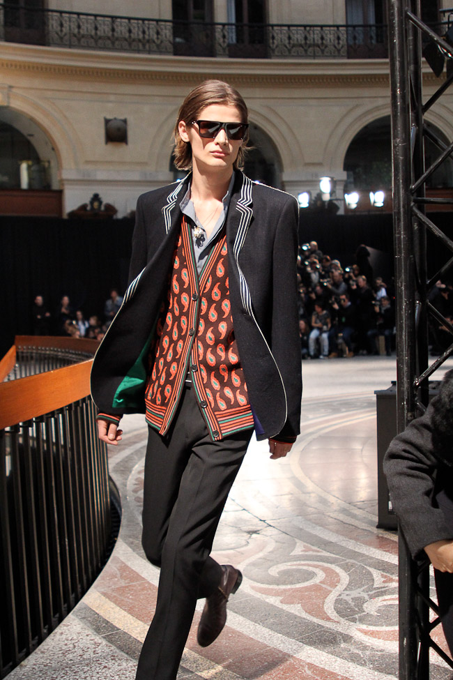 Les motifs sont des dinosaures, des pèches et des imprimés cachemire. Les dinos sont imprimés ou apparaissent sous forme de jacquards en relief. Les pèches sur des bombers rappellent que Paul Smith a été l’un des pionniers de l’impression photo sur tissu.