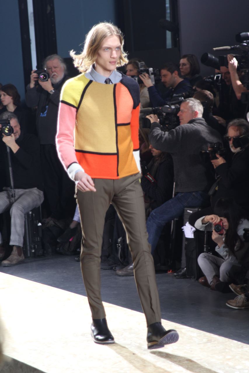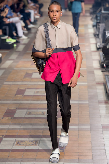 Ce sont des combinaisons de bleu et de noir assez complexes chez Dior homme sur des vestes et bermudas. Des séparations verticales chez Lanvin : bleues, grises et noires ou beiges, grises et roses. Hermès se démarque avec des blocs sans angles droits. Paul Smith combine tons pastels et rose fluo. Newman propose des « vêtements puzzle » avec des manches, col, bords cotes et poches de couleurs différentes. Lyle&Scott, Marni et Asos déclinent cette tendance de façon plus discrète avec du bleu et du noir.