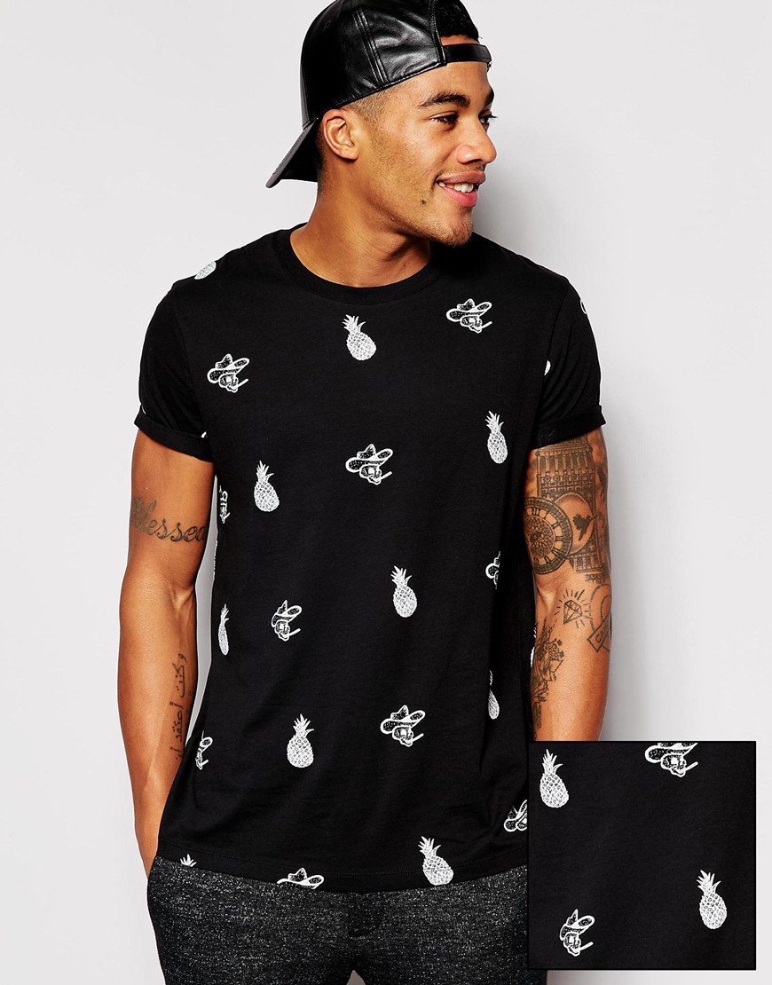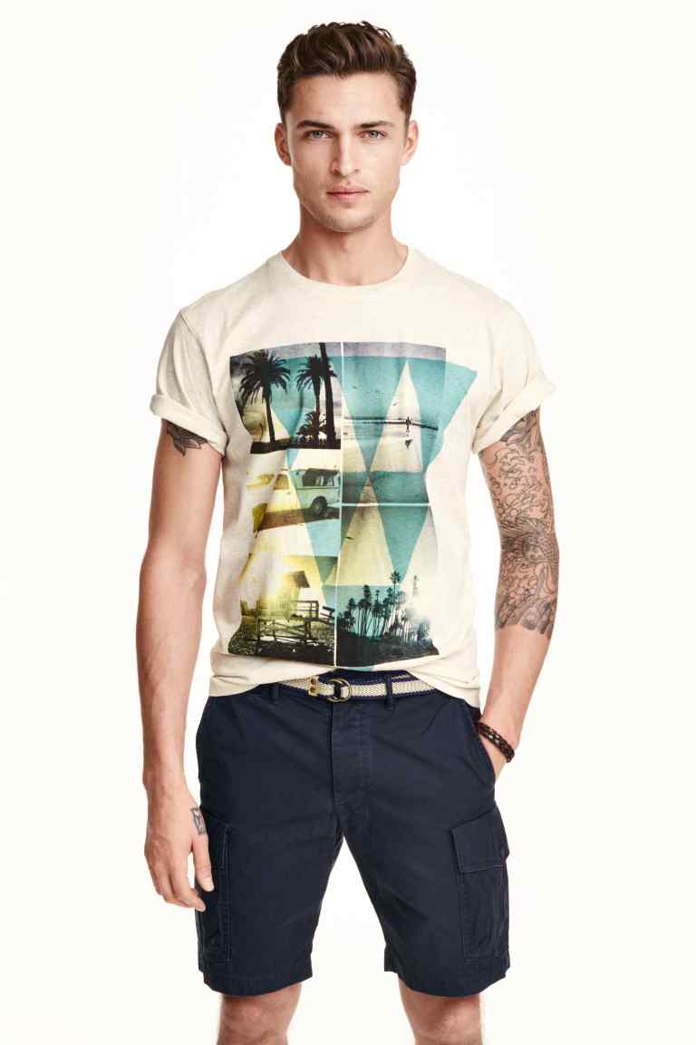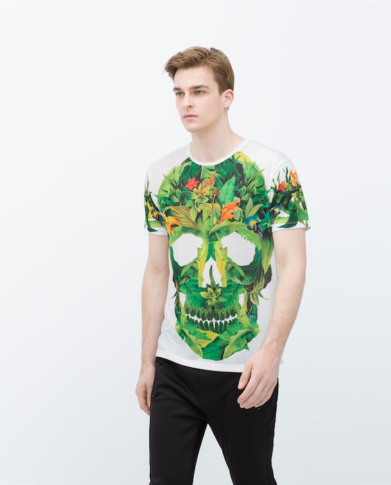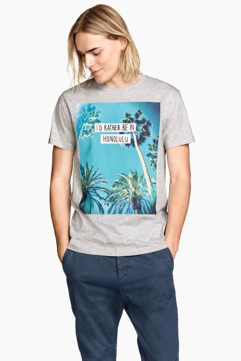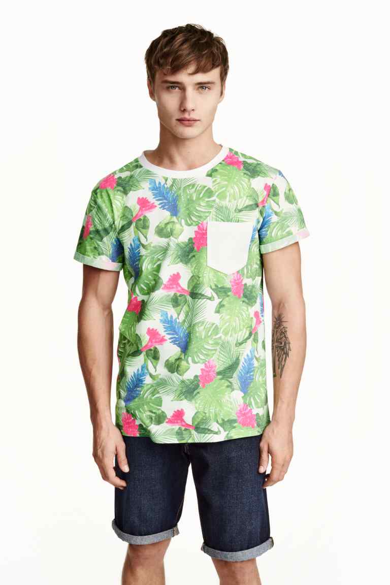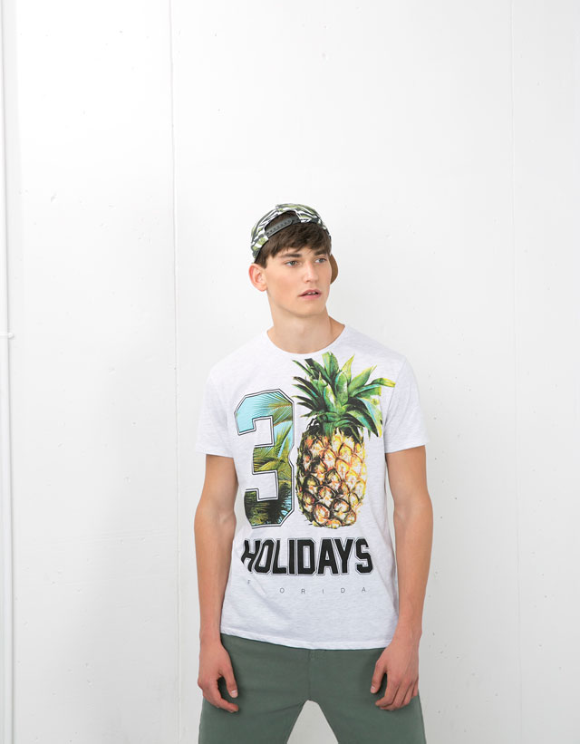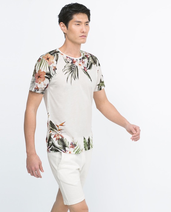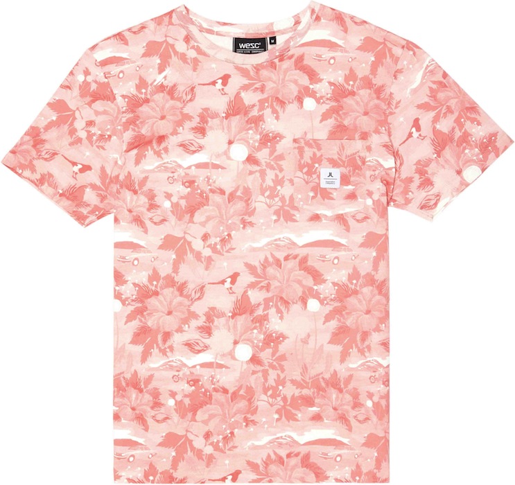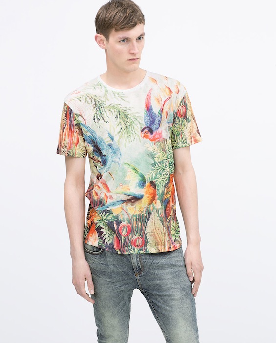 Honolulu, Palm spring, Papete, Iguazu… Les vacances… loin ! Dans des destinations lointaines, sous les tropiques, des îles paradisiaques, à Hawaï, à Miami ou en Californie. Des imprimés de végétaux tropicaux, de plantes luxuriantes, de palmiers, d’ananas, d’ibiscus. Des oiseaux exotiques, toucans, perroquets. Sous forme de dessins, de photos et d’imprimés photos « all over » qui recouvrent l’intégralité du T-shirt. Mais aussi des rayures à la façon d’une marinière. Des têtes de mort. Et parfois des T-shirt qui mèlent plusieurs de ces styles. Comme si les manches ou la poche de l’un avait été cousus sur le corps de l’autre. Autres tendances de cet été : Star Wars présent chez quantité de marques et les T-shirts à message textuel, un phénomène de l’année dernière qui se poursuit.