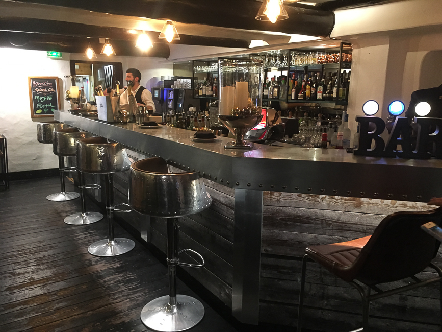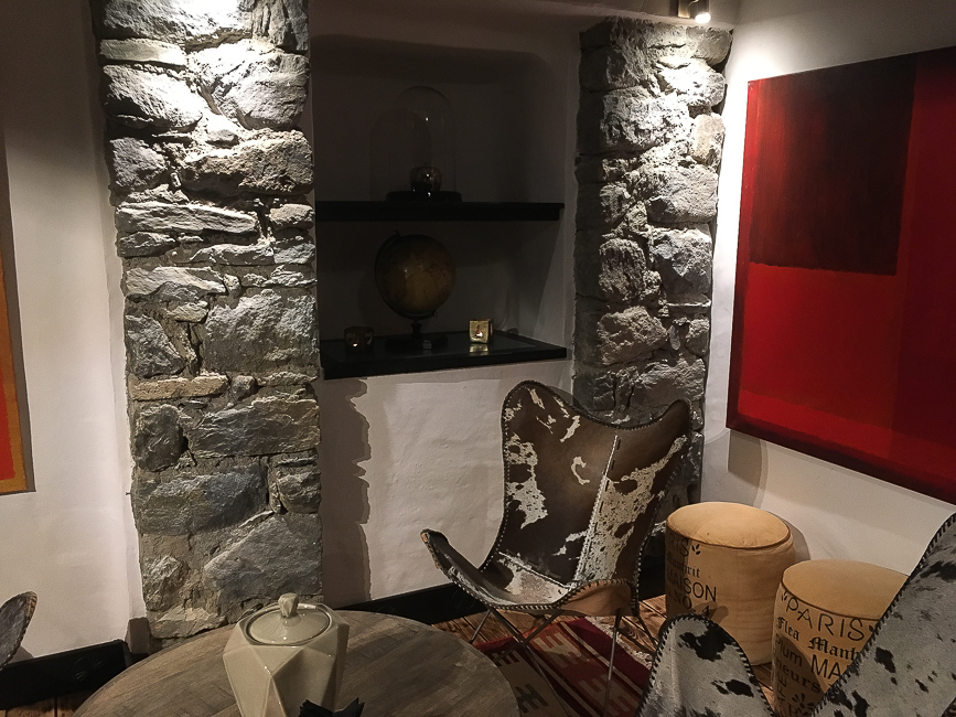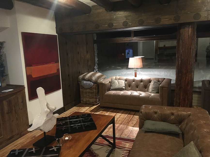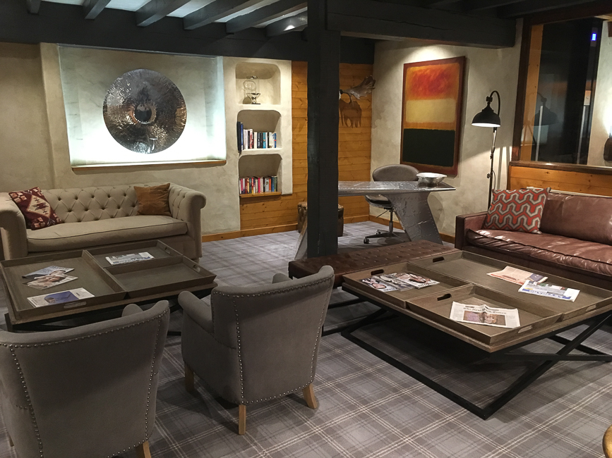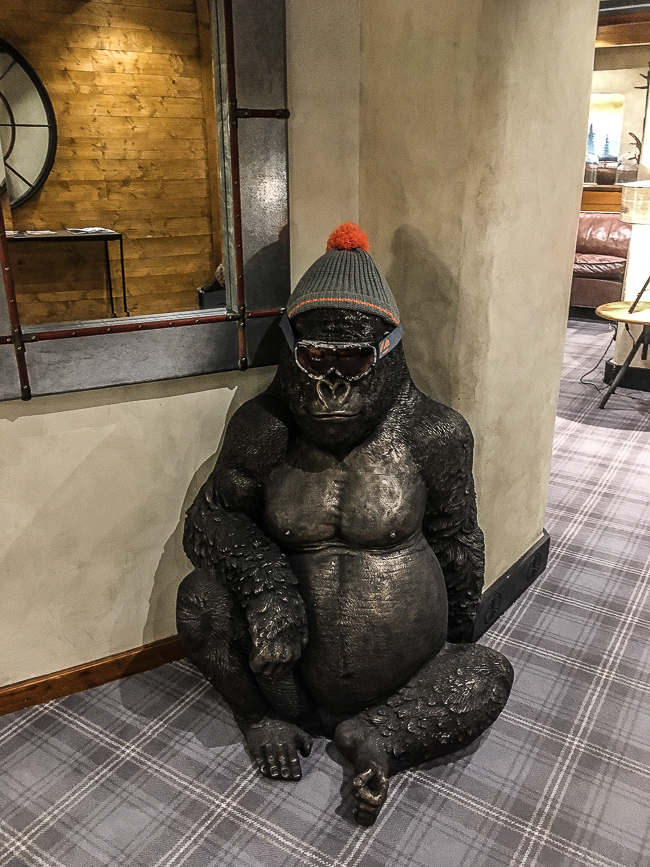 La décoration des parties communes de l’hôtel a été refaite l’hiver dernier. C’est un mélange éclectique et ludique de différentes inspirations : On y trouve des tapis avec motifs Navajo qui évoquent la décoration des maisons des montagnes de l’Utah. Ou bien de la moquette imprimé tartan Highland. Des fauteuils Club et Chesterfield. Un bar directement inspiré du style britannique que l’on pourrait trouver à Londres. Et toutes sortes d’objets insolites : Un lustre enfermé dans une cage à oiseaux. Des trophées de chasse de porcelaine. Un gorille de bronze sagement assis dans un coin.