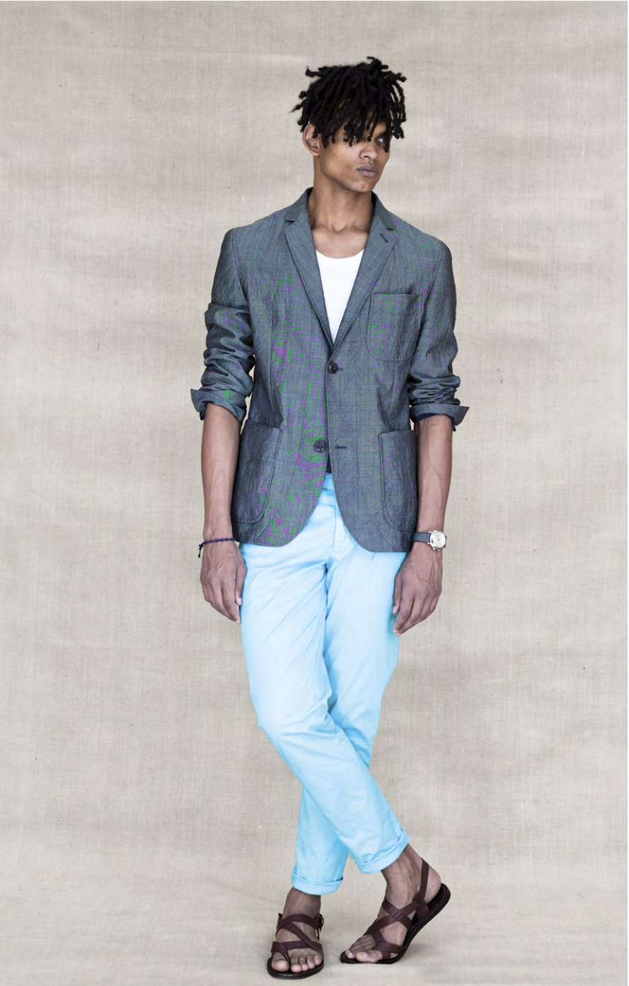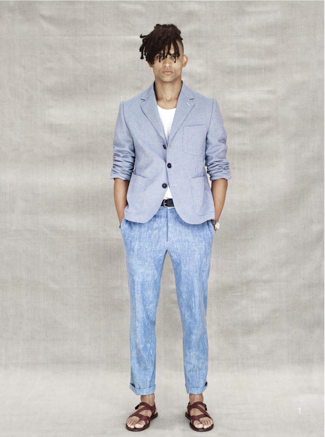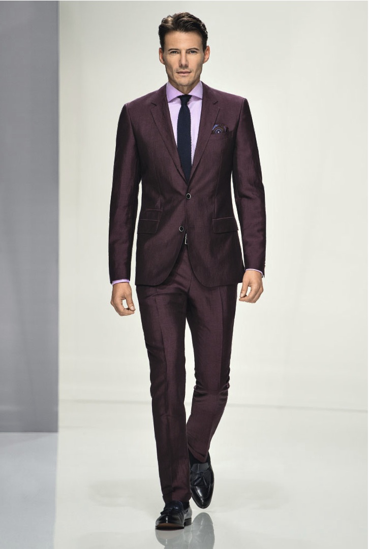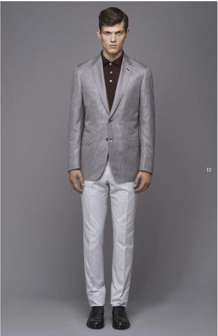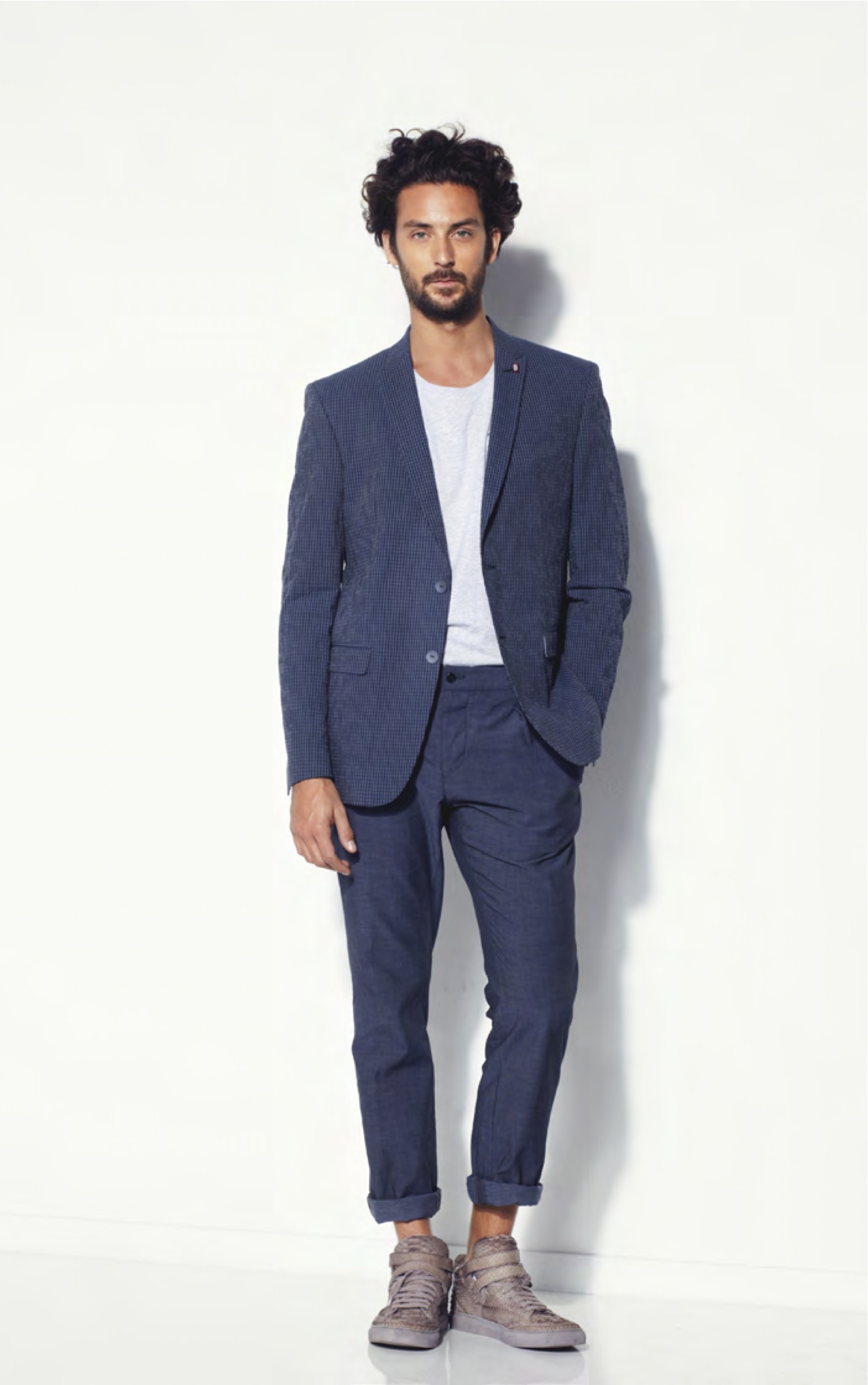 Le point commun des vestes de l’été 2014, c’est la fermeture à 2 boutons. La version à un bouton concerne surtout les tenues de soirée et vêtements de prestige comme les smokings. Dans les photos ci-dessous, vous pouvez remarquer que presque toujours seul le bouton du haut est fermé, pour une allure décontractée. Certaines vestes ont une fermeture croisée à la façon des blazers. Les tissus sont en général assez rigides avec une coupe ajustée, près du corps. Dans ce cas, les vestes sont longues : elles arrivent jusqu’à la fourche du pantalon. Pour une allure plus estivale, certaines sont au contraire faite d’un tissus souple, léger et dans des tons clairs. Dans ce cas, la coupe est plus courte. Parfois la veste s’arrête au niveau de la ceinture. Les tissus sont colorés, très peu de noirs et de gris, mais du violet, du bordeaux, du vert, toutes sortes de bleus, du beige.