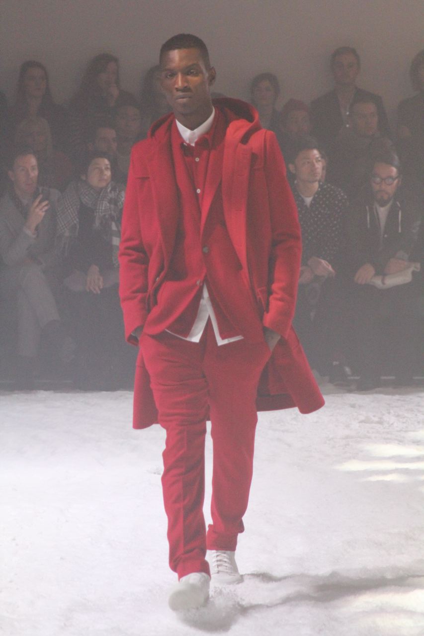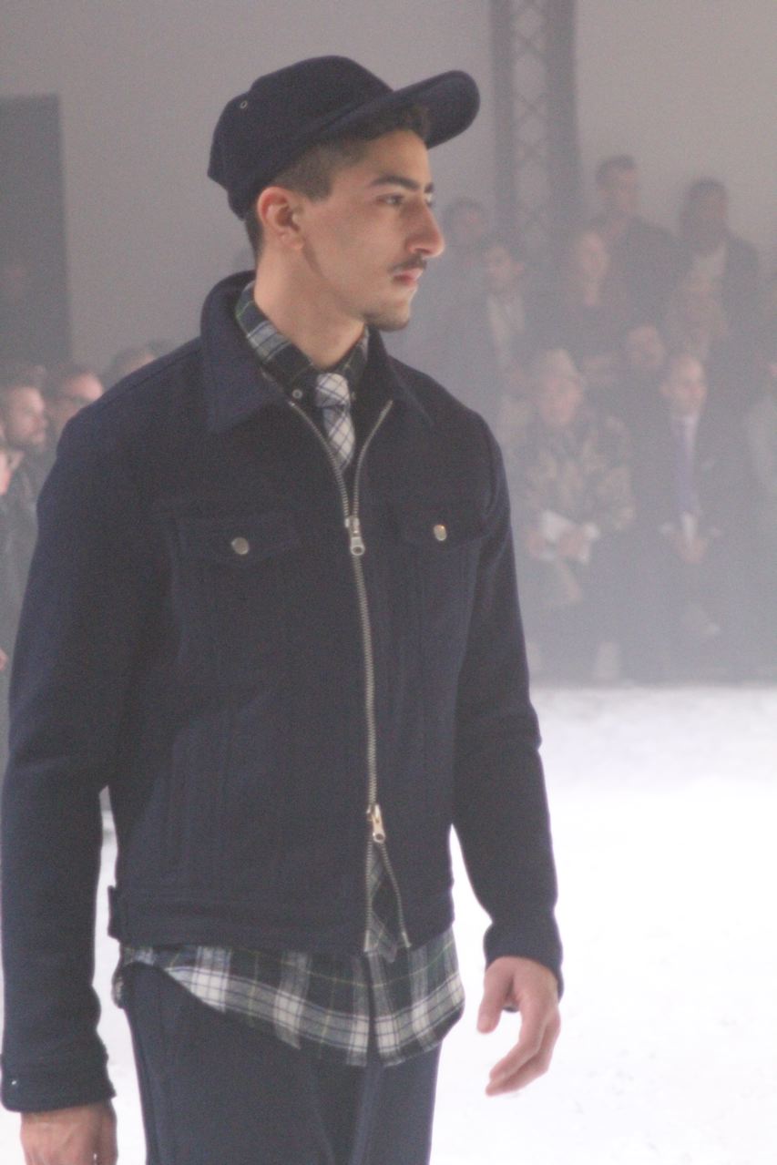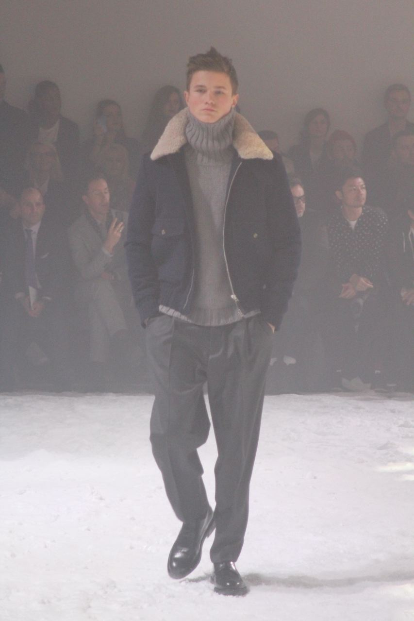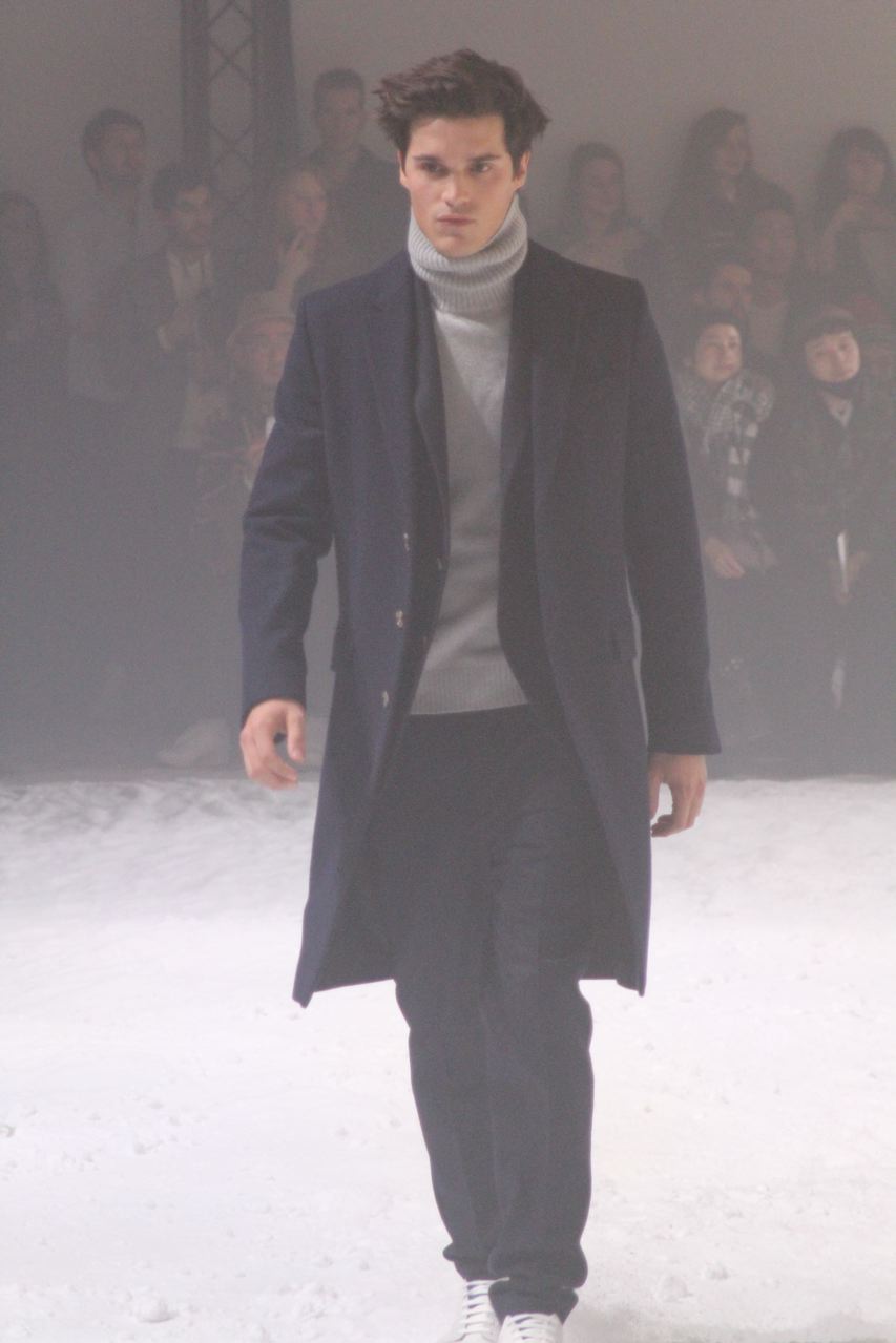 Alexandre Mattiussi pour ses collections de vêtements pour homme AMI nous a habitué a des tissus qui ont de la matière, qui rappellent parfois les années 40 et 50 avec flanelle, prince-de-Galles, pieds de poule. Des tissus qui ont une vie, épais, laineux, doux et confortables. Cela se traduit par de grosses écharpes, des blousons au col fourrure de mouton, de longs manteaux en drap de laine, droits ou fermés comme des cabans, des costumes amples, des bombers… Toute la panoplie du vestiaire masculin, très viril.