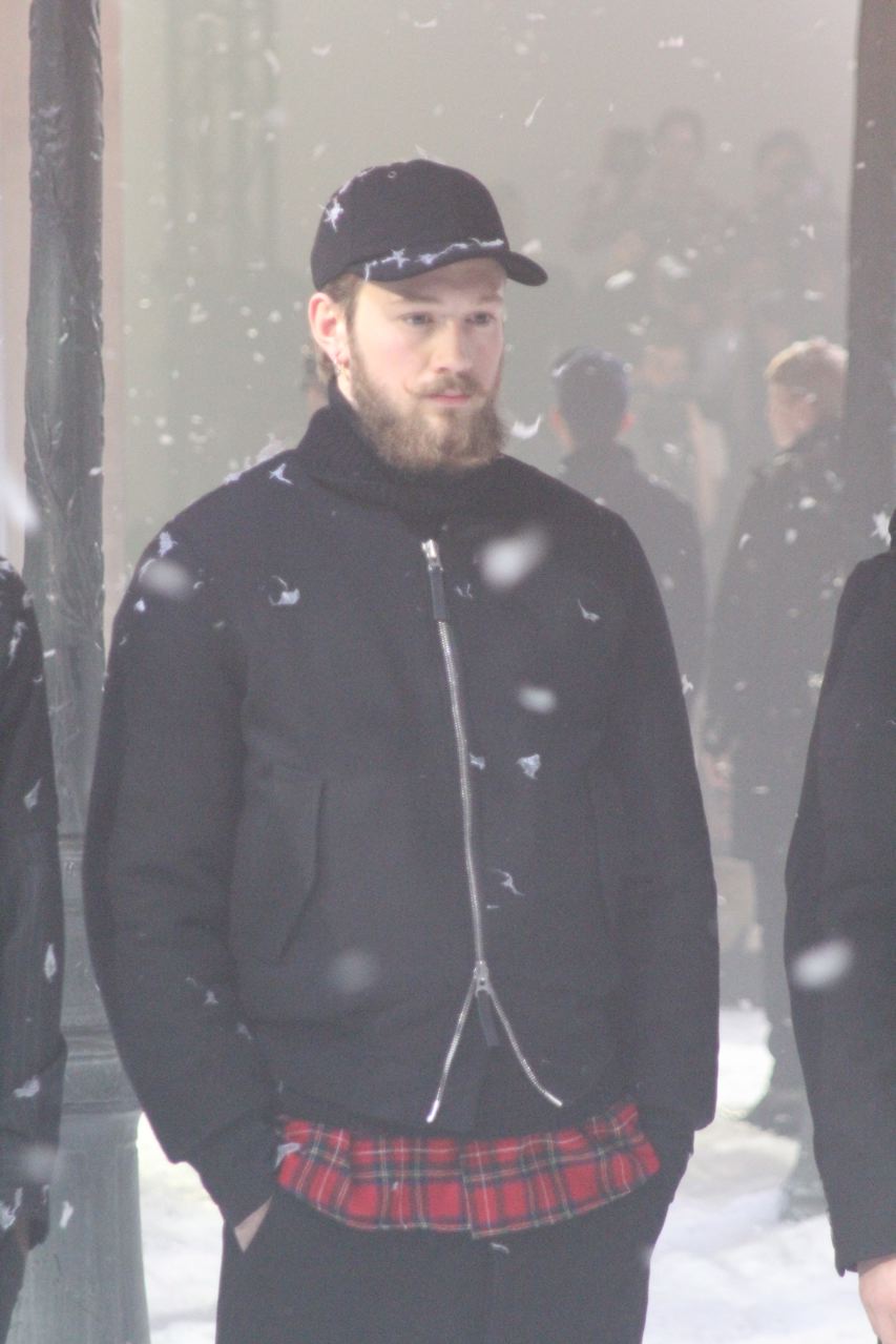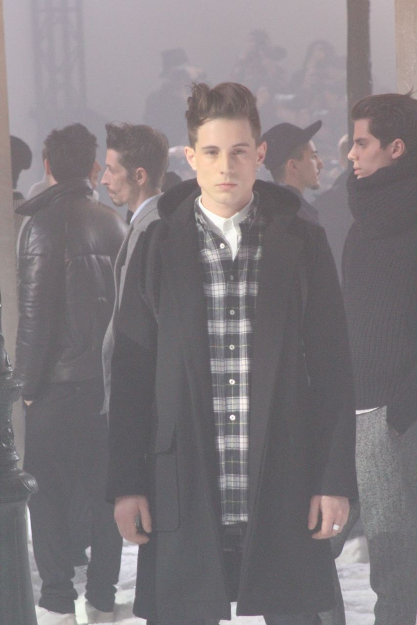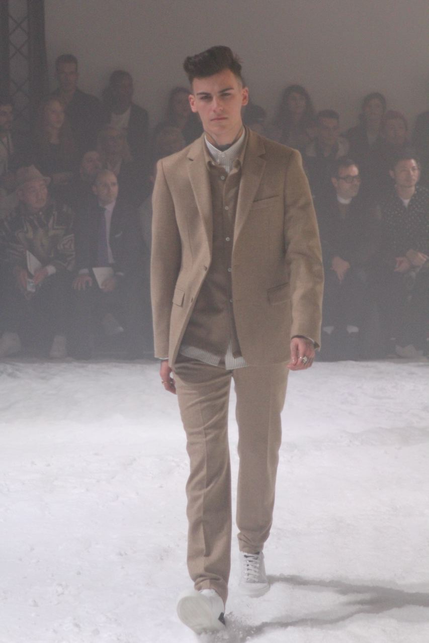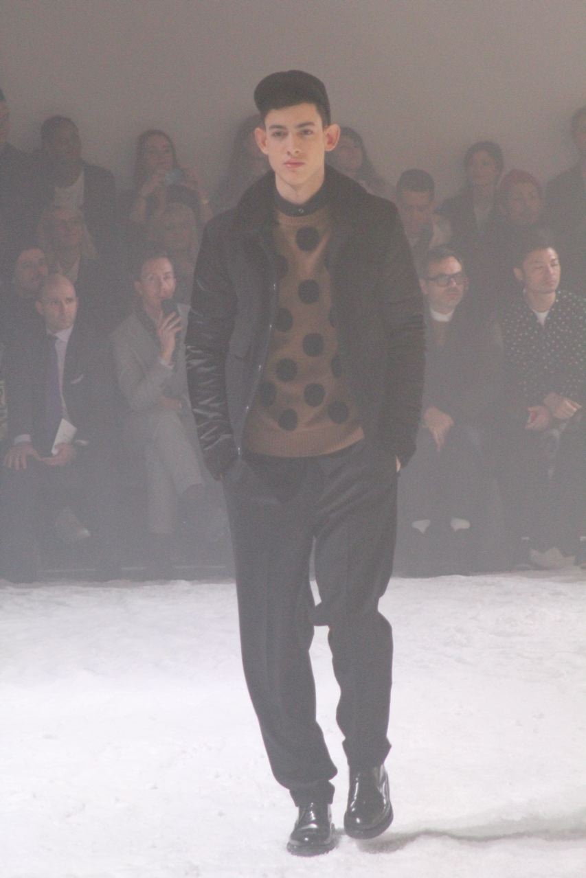 Alexandre Mattiussi pour ses collections de vêtements pour homme AMI nous a habitué a des tissus qui ont de la matière, qui rappellent parfois les années 40 et 50 avec flanelle, prince-de-Galles, pieds de poule. Des tissus qui ont une vie, épais, laineux, doux et confortables. Cela se traduit par de grosses écharpes, des blousons au col fourrure de mouton, de longs manteaux en drap de laine, droits ou fermés comme des cabans, des costumes amples, des bombers… Toute la panoplie du vestiaire masculin, très viril.