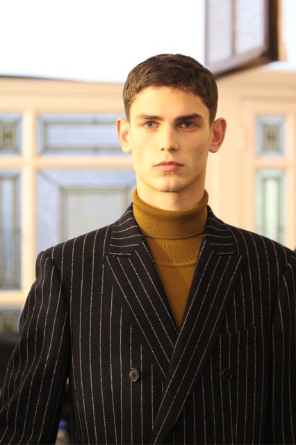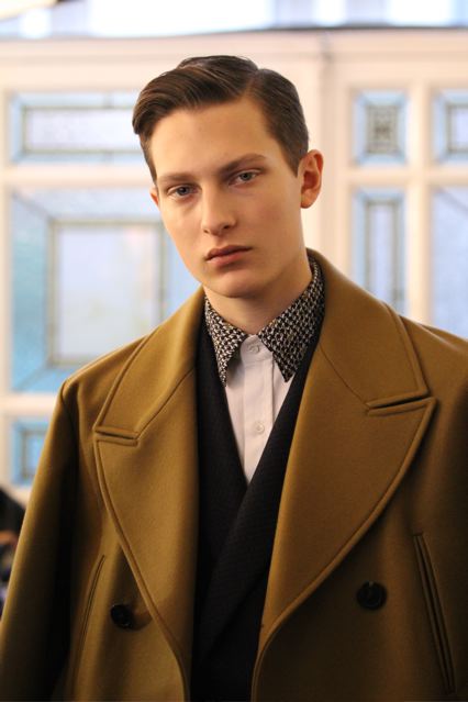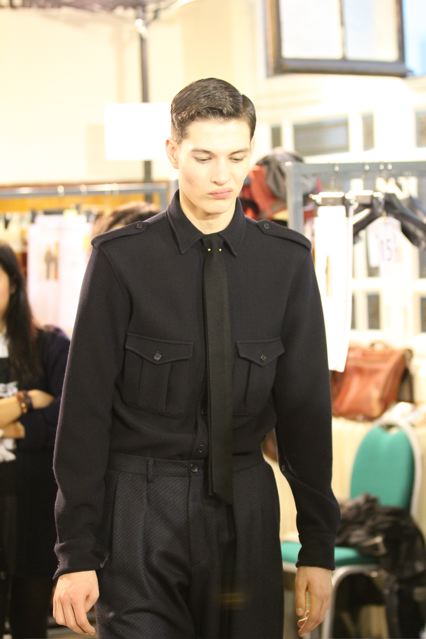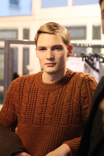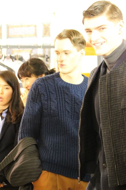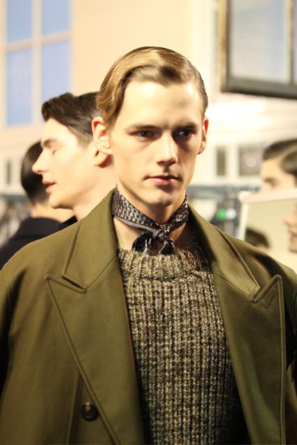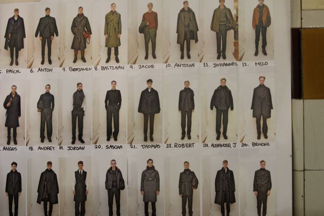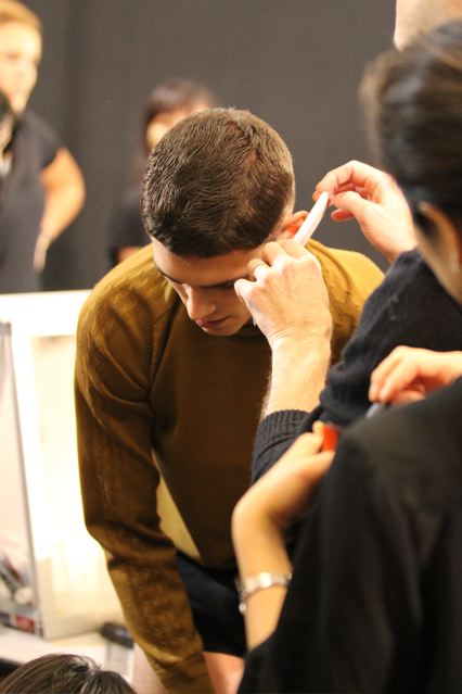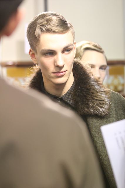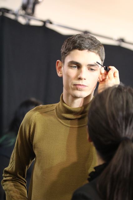 Quelques images de l’attente, à quelques minutes du début du défilé homme de la collection Wooyoungmi. Derniers ajustements et maquillage pour les mannequins. Voir le compte rendu du défilé.